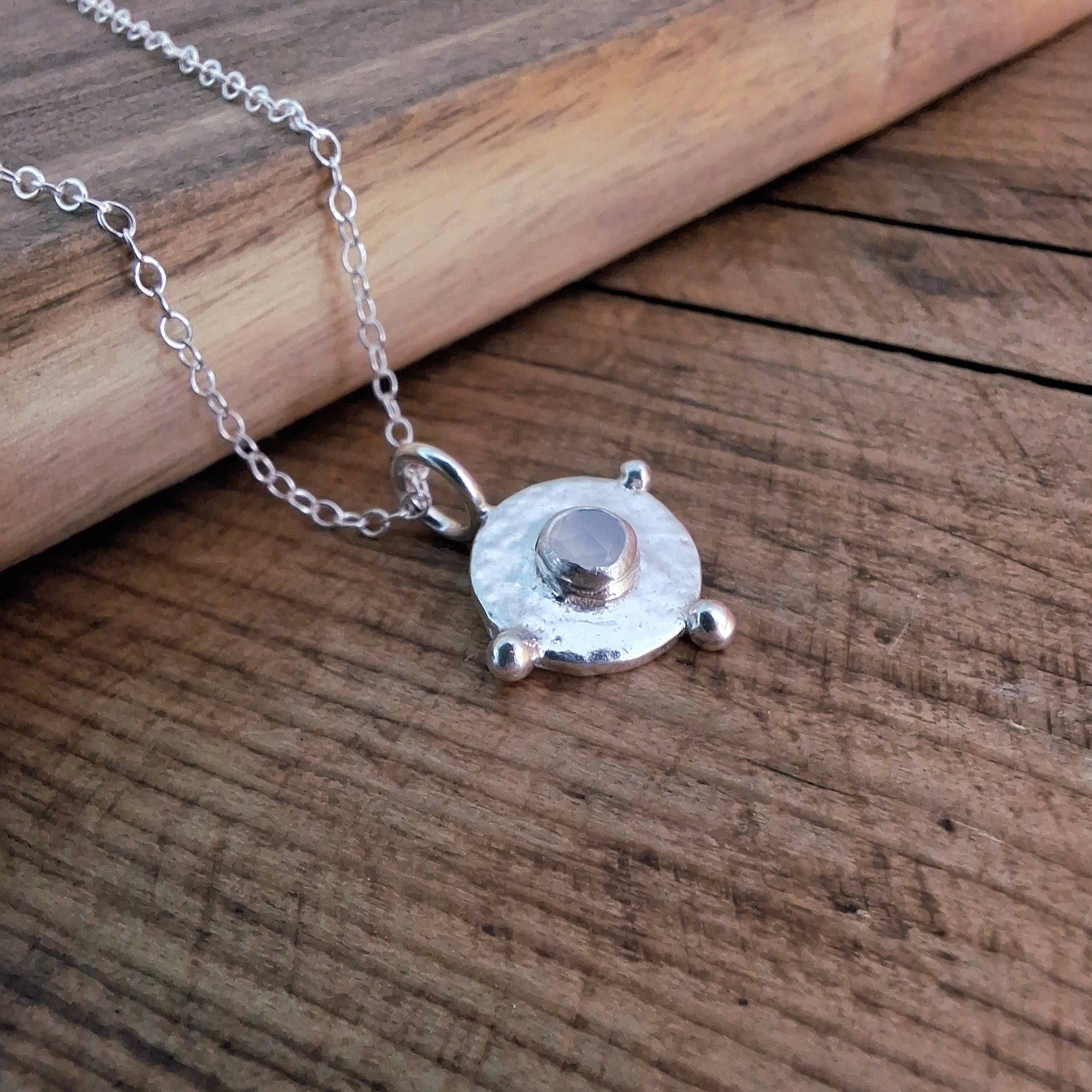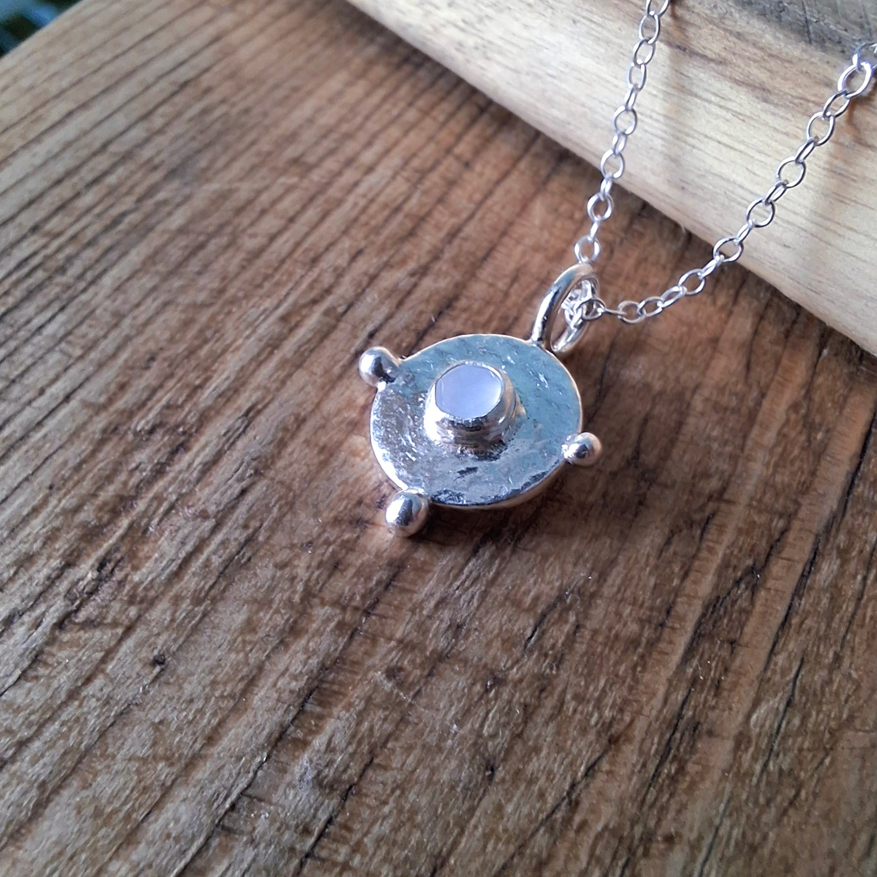 A small round silver charm with dots around the border and a beautiful soft shimmering Chalcedony in the middle, the perfect companion for the happy boho soul within you 🥰