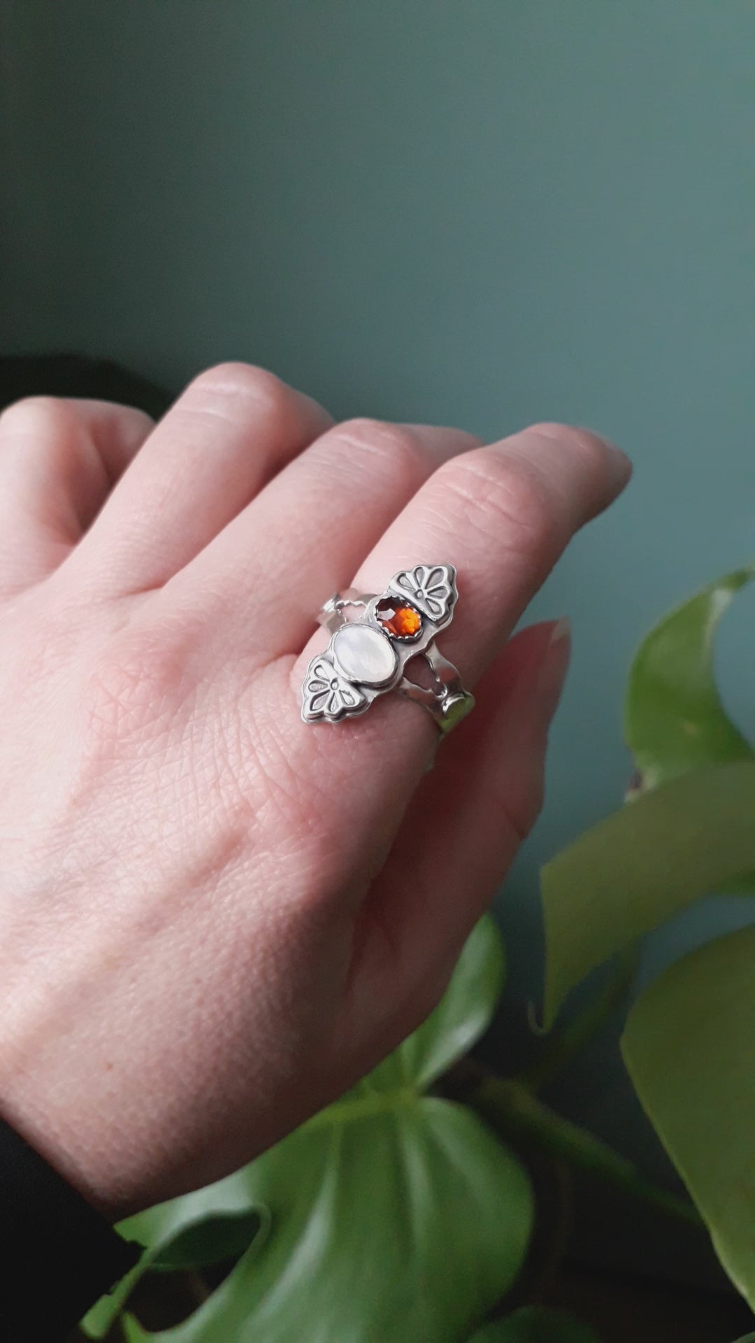 🧡 A big gemstone statement ring with a stunning, warm hessonite garnet and mother of pearl stone. Lots of detail went into this ring, with flowy waves worked into the ring band. An ode to last century's hippie romantic, channeling art noveau and Stevie Nicks vibes.