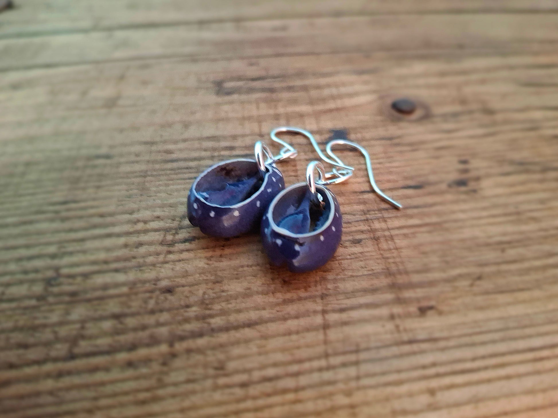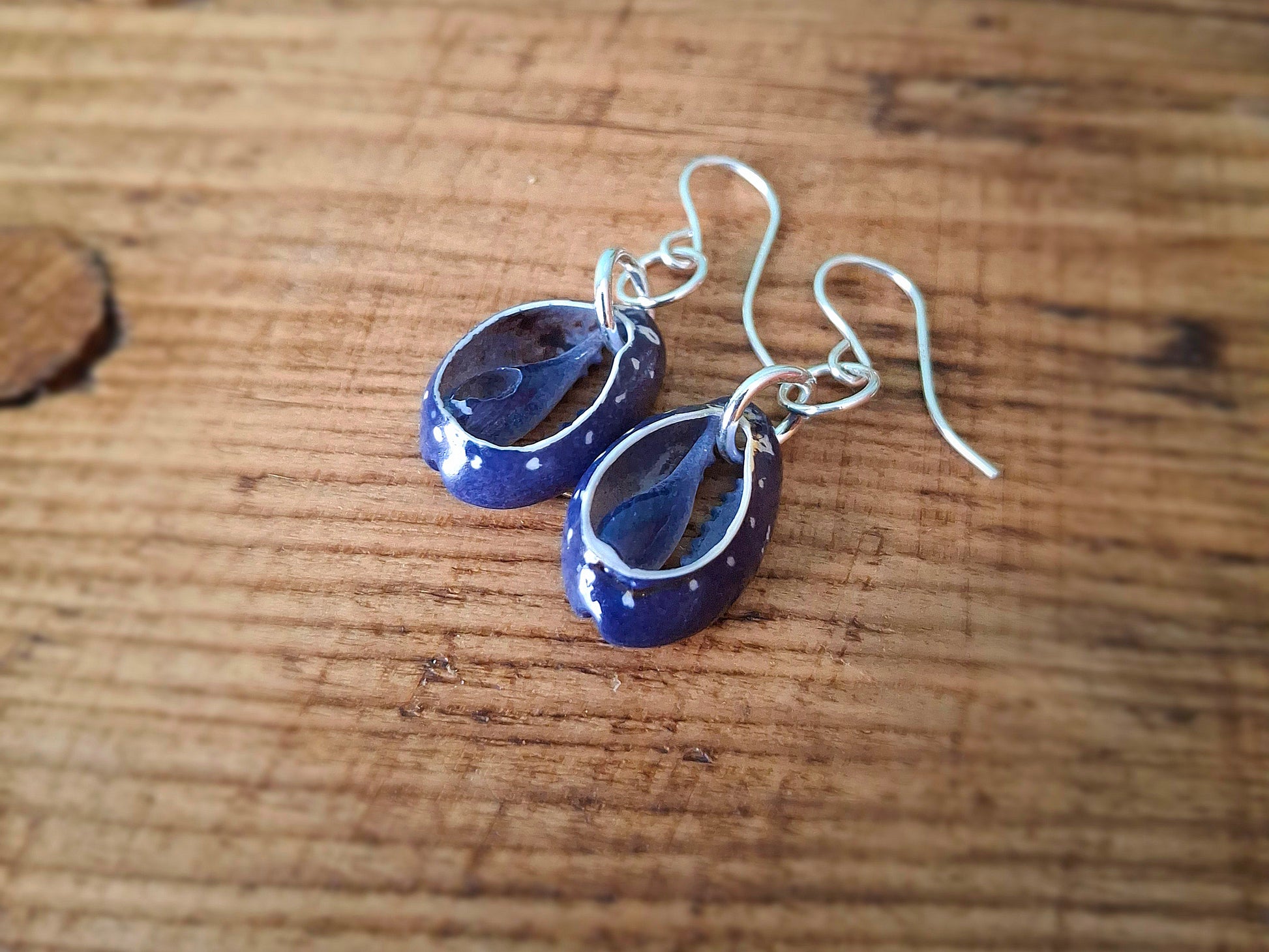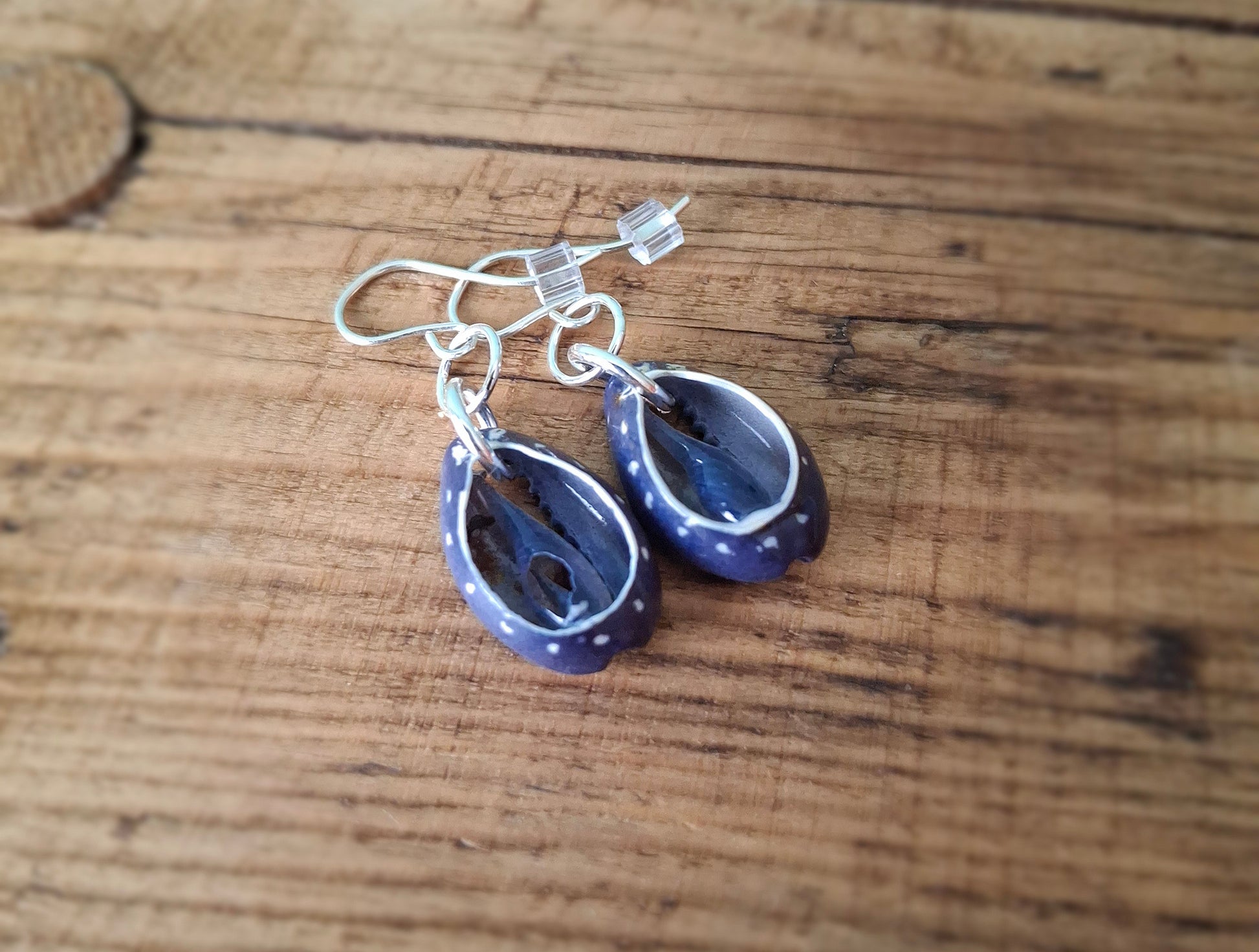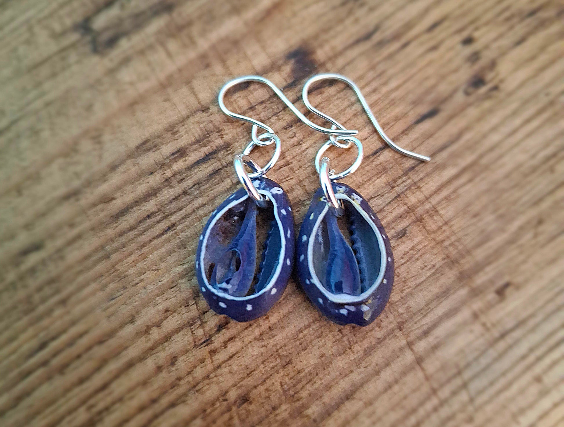 💚An ode to the ocean and the beach, Cowrie shell jewellery is a perfect summer and holiday accessory. Dyed in an elegant navy blue and a small dotted pattern around the opening, these earrings work well with a casual as well as a bit more chic and classy outfit.
