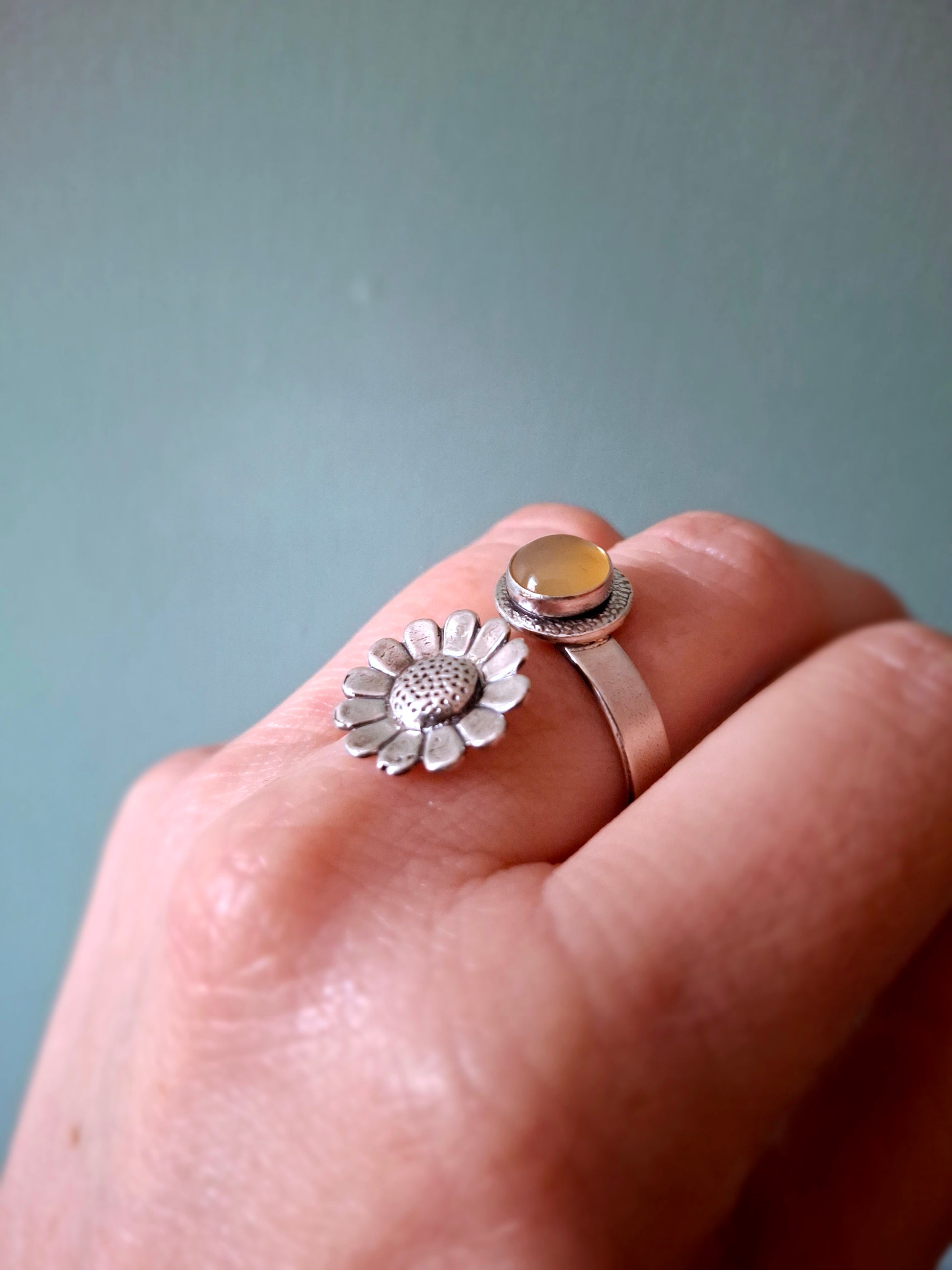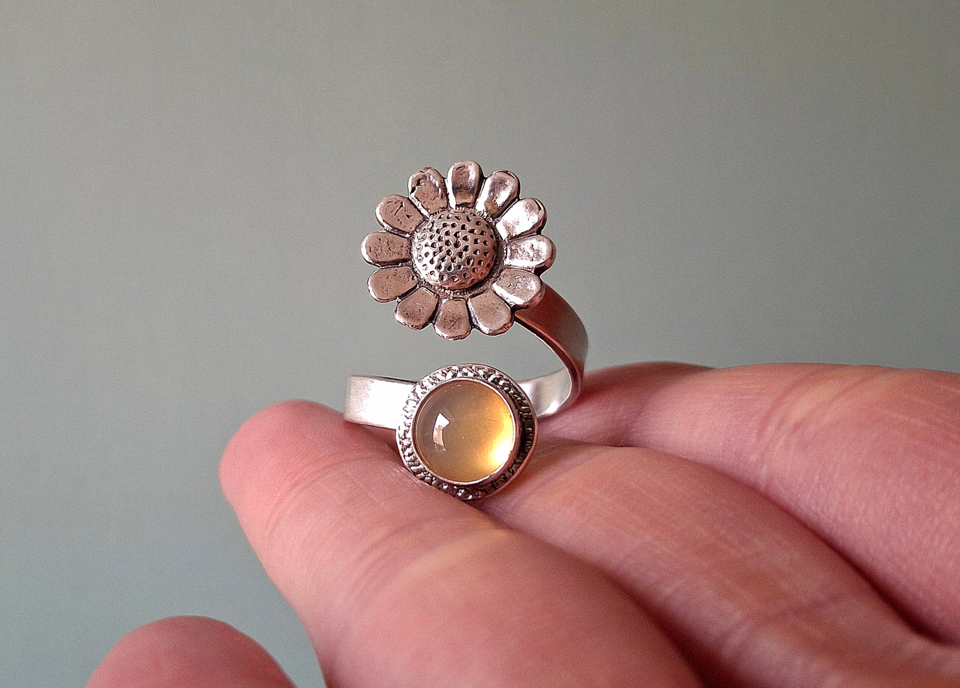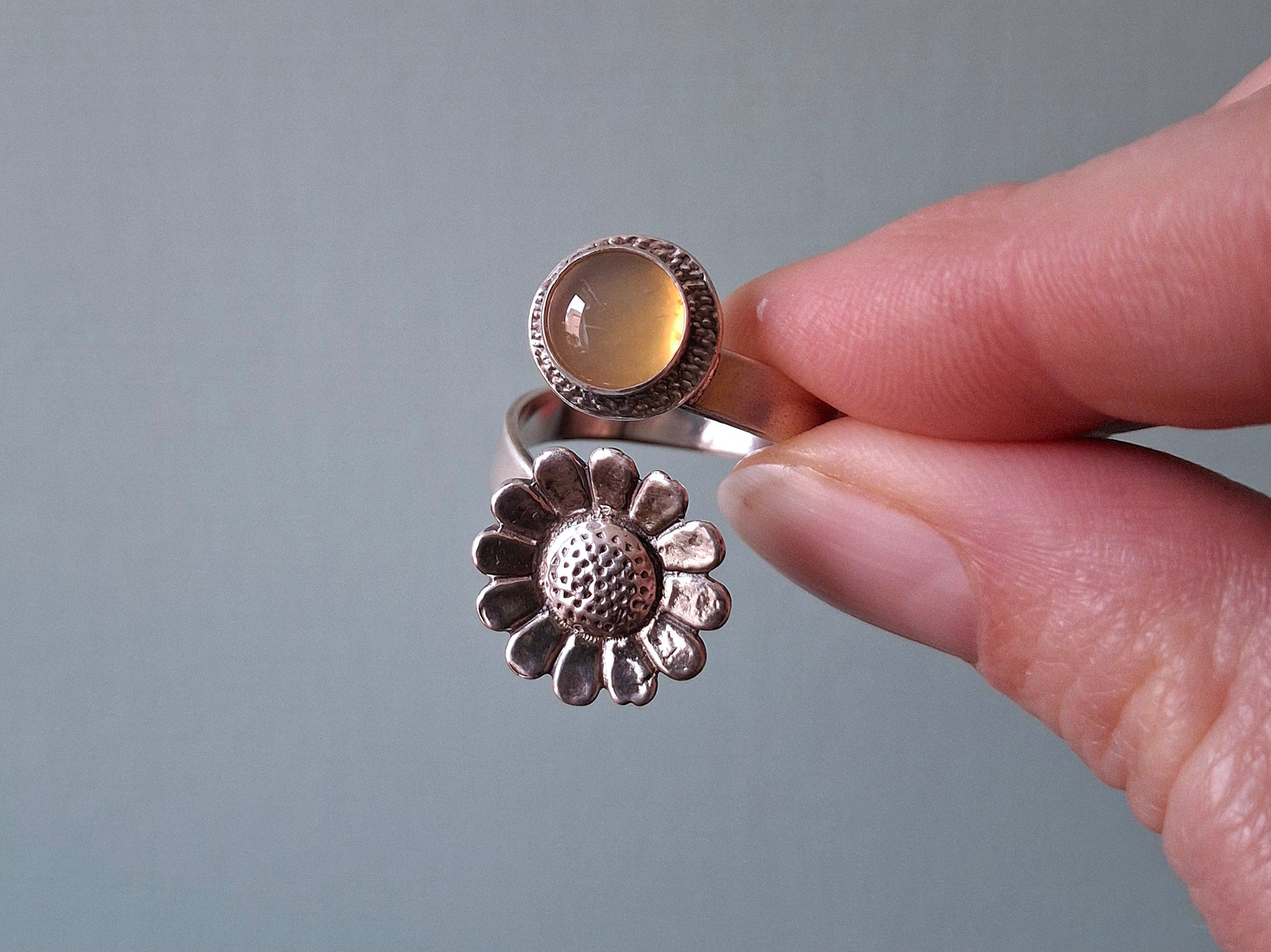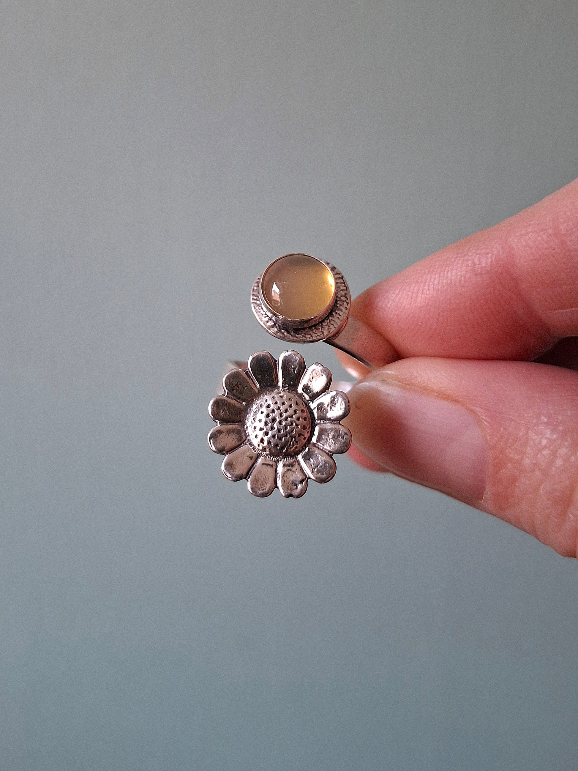❤ The ring is a UK size P but you can slightly size it up or down by gently pulling or squeezing it together. The stone is 0.8cm big and the daisy charm is about 1.5cm big. The ring band has a width of 4mm