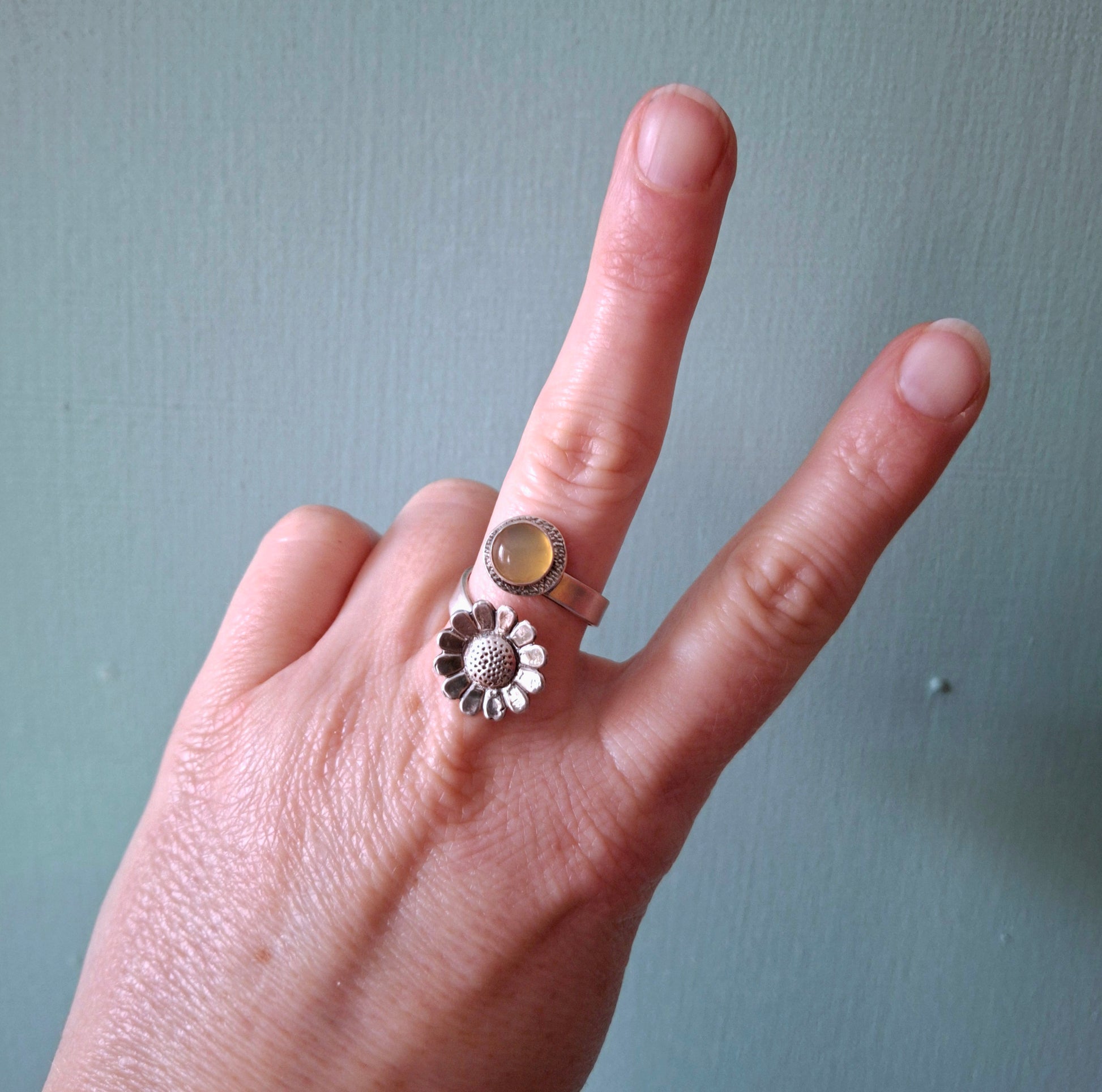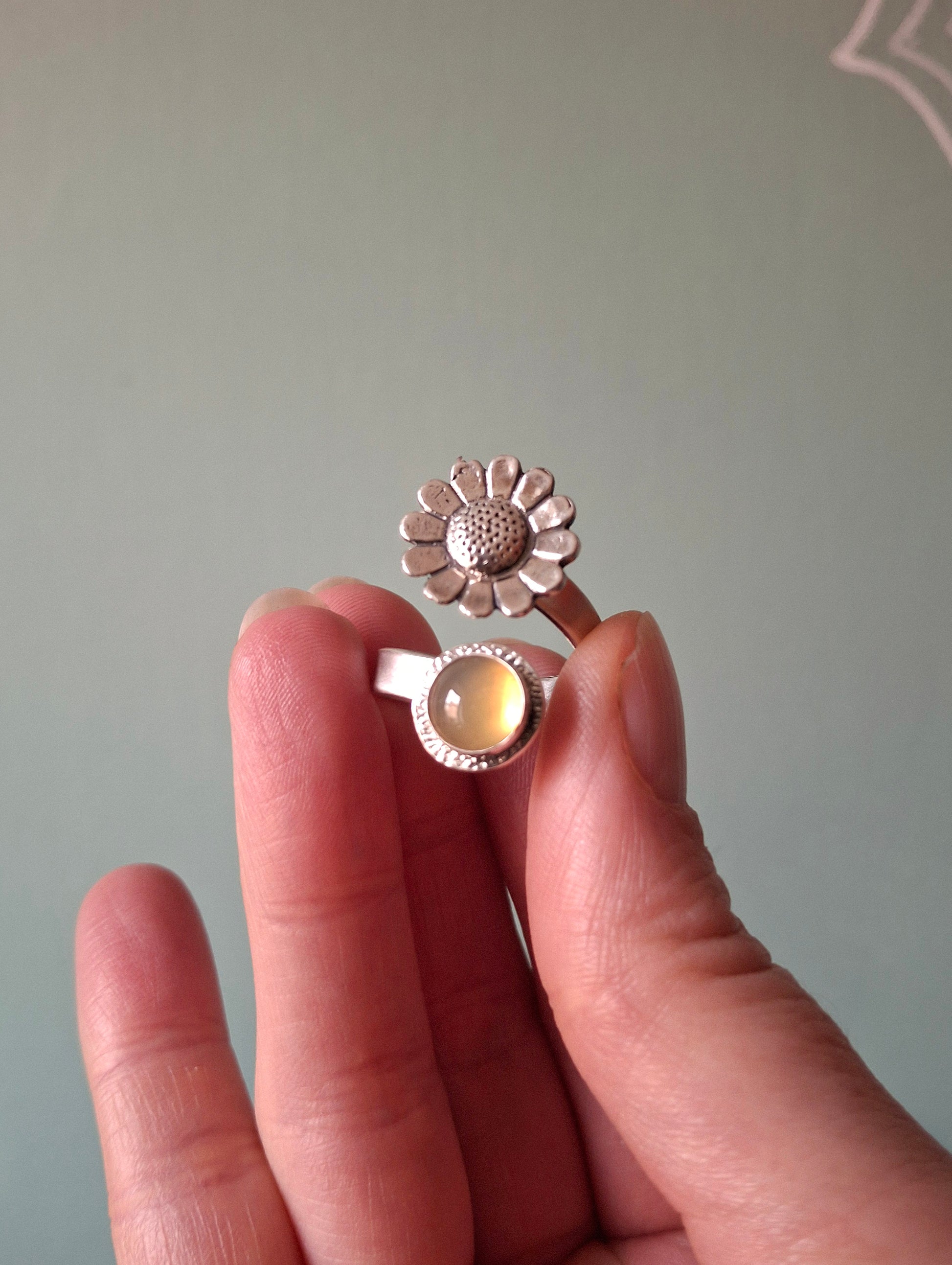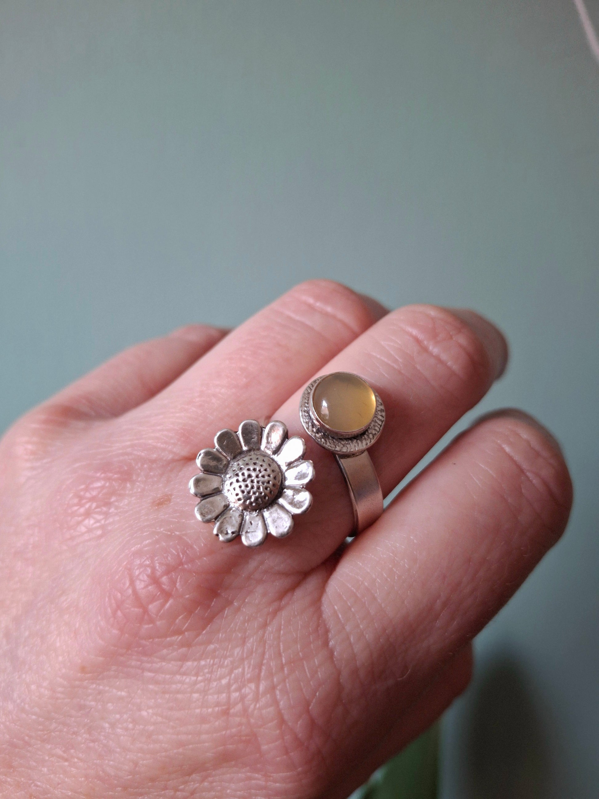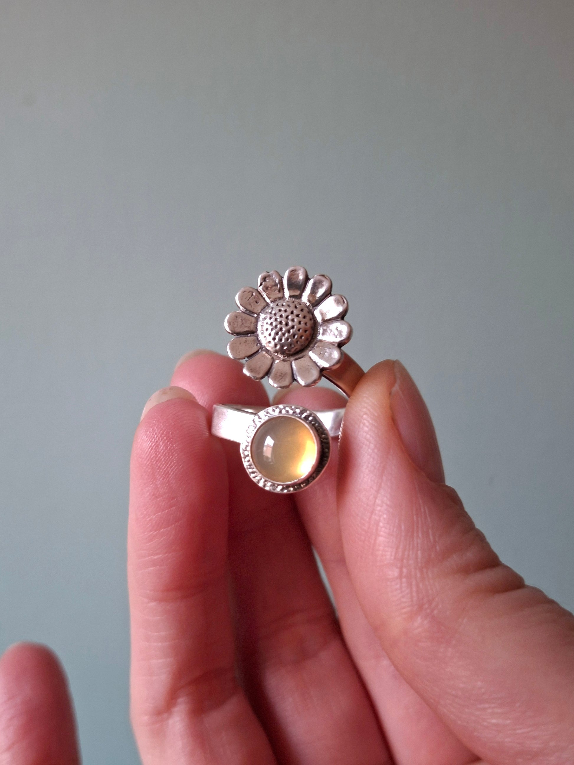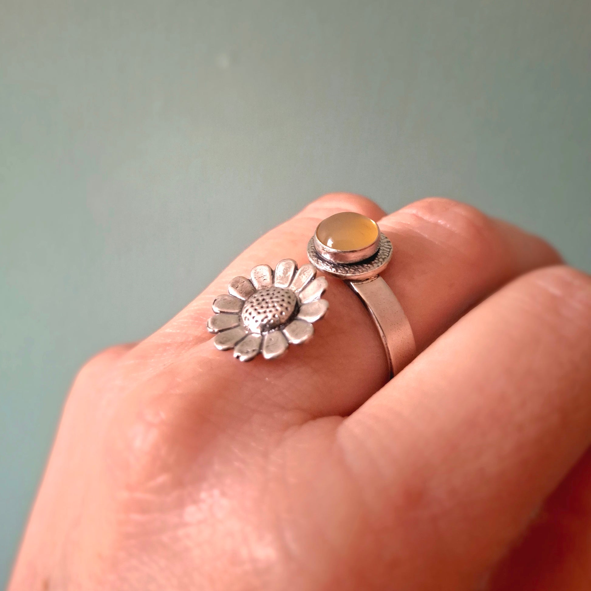 ❤ The ring is a UK size P but you can slightly size it up or down by gently pulling or squeezing it together. The stone is 0.8cm big and the daisy charm is about 1.5cm big. The ring band has a width of 4mm