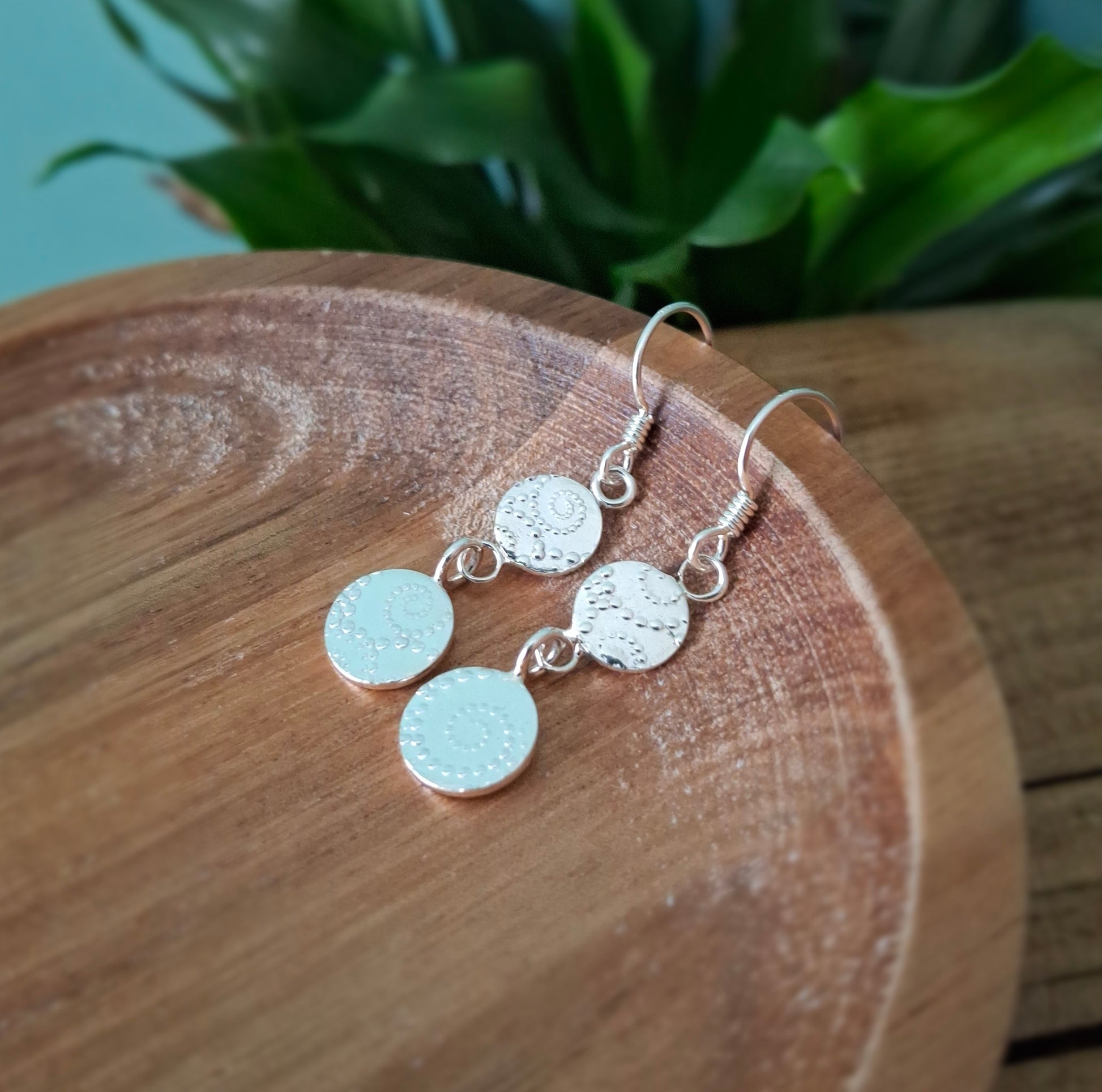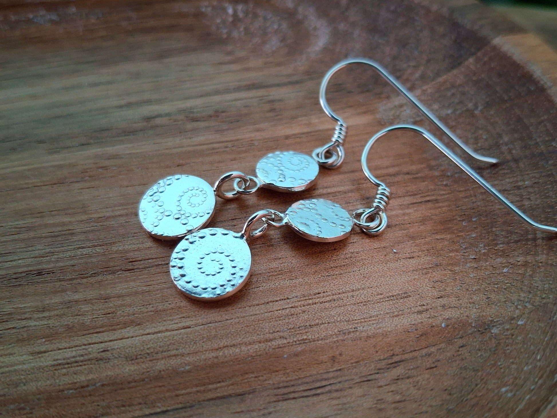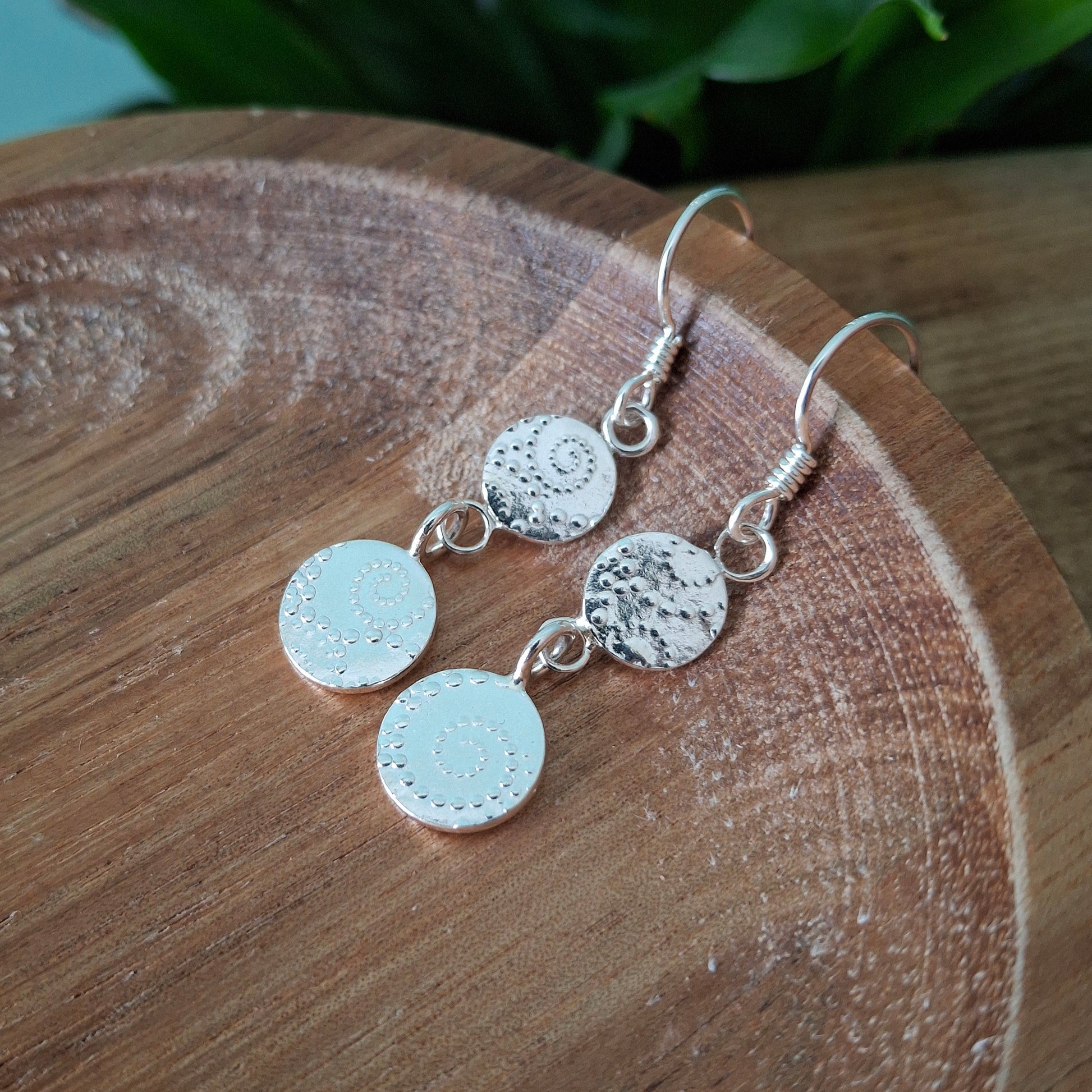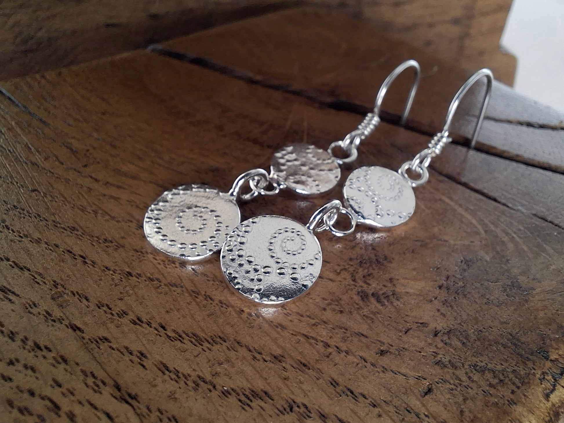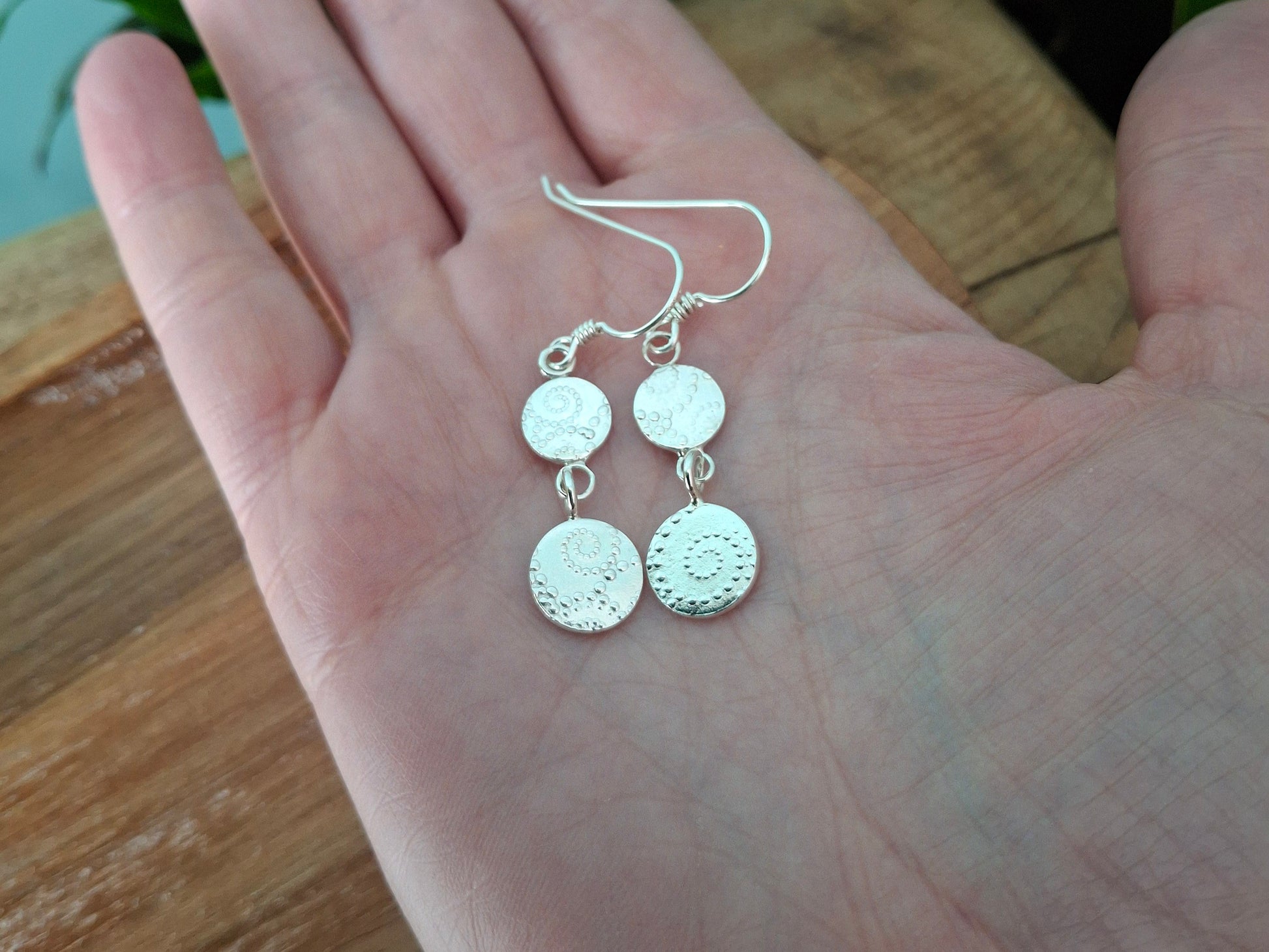 Beautiful silver charm earrings with a dotted wave pattern that reminds me of shells and the sea.