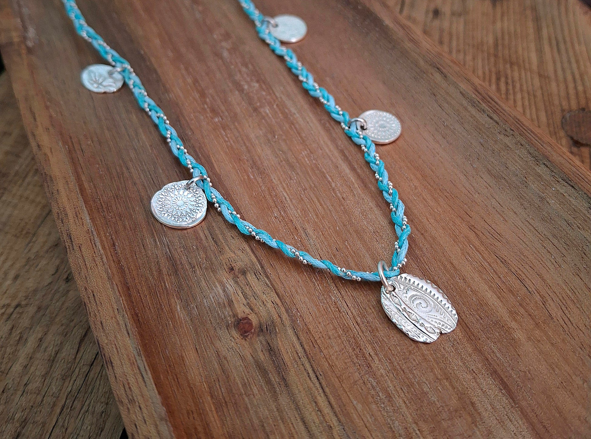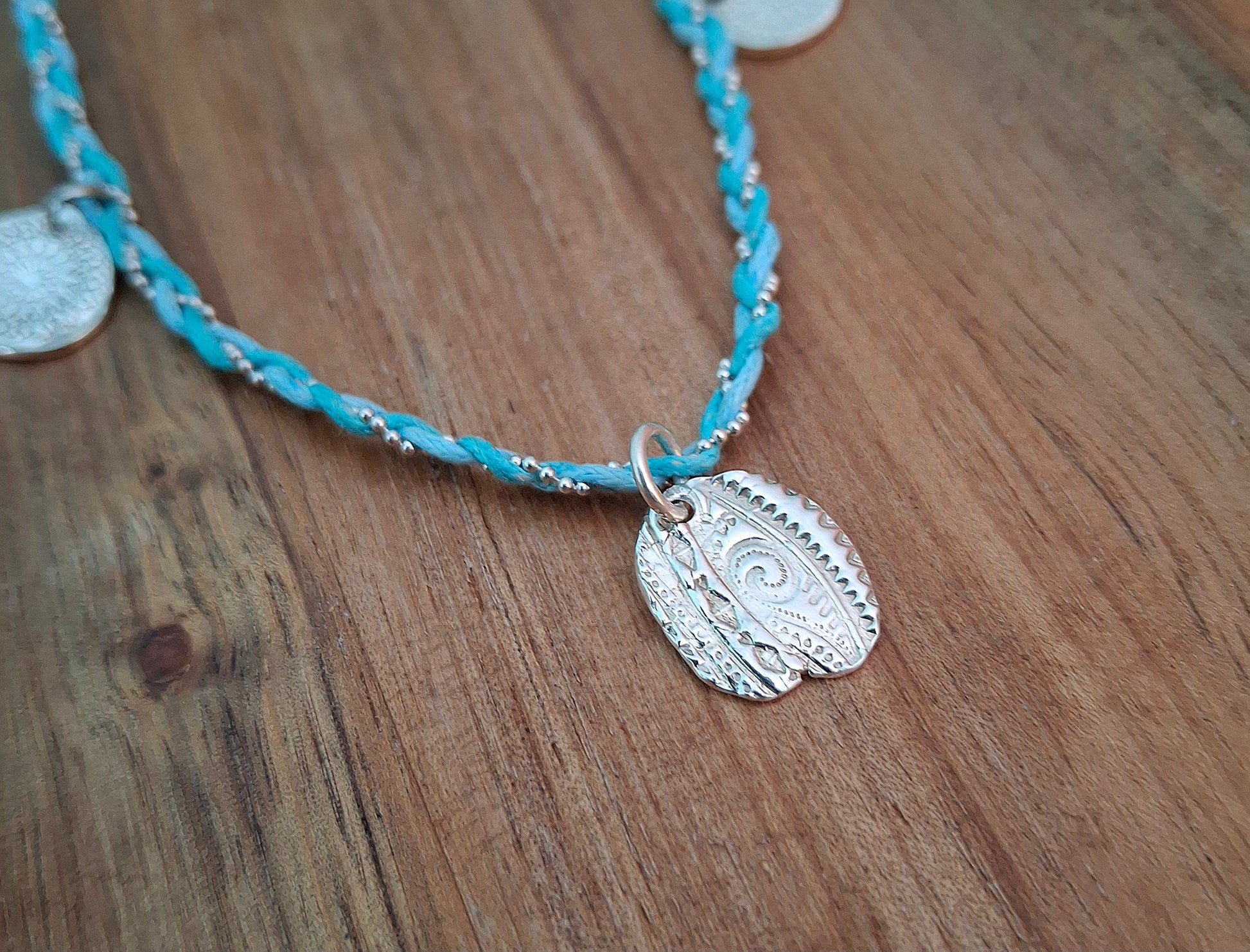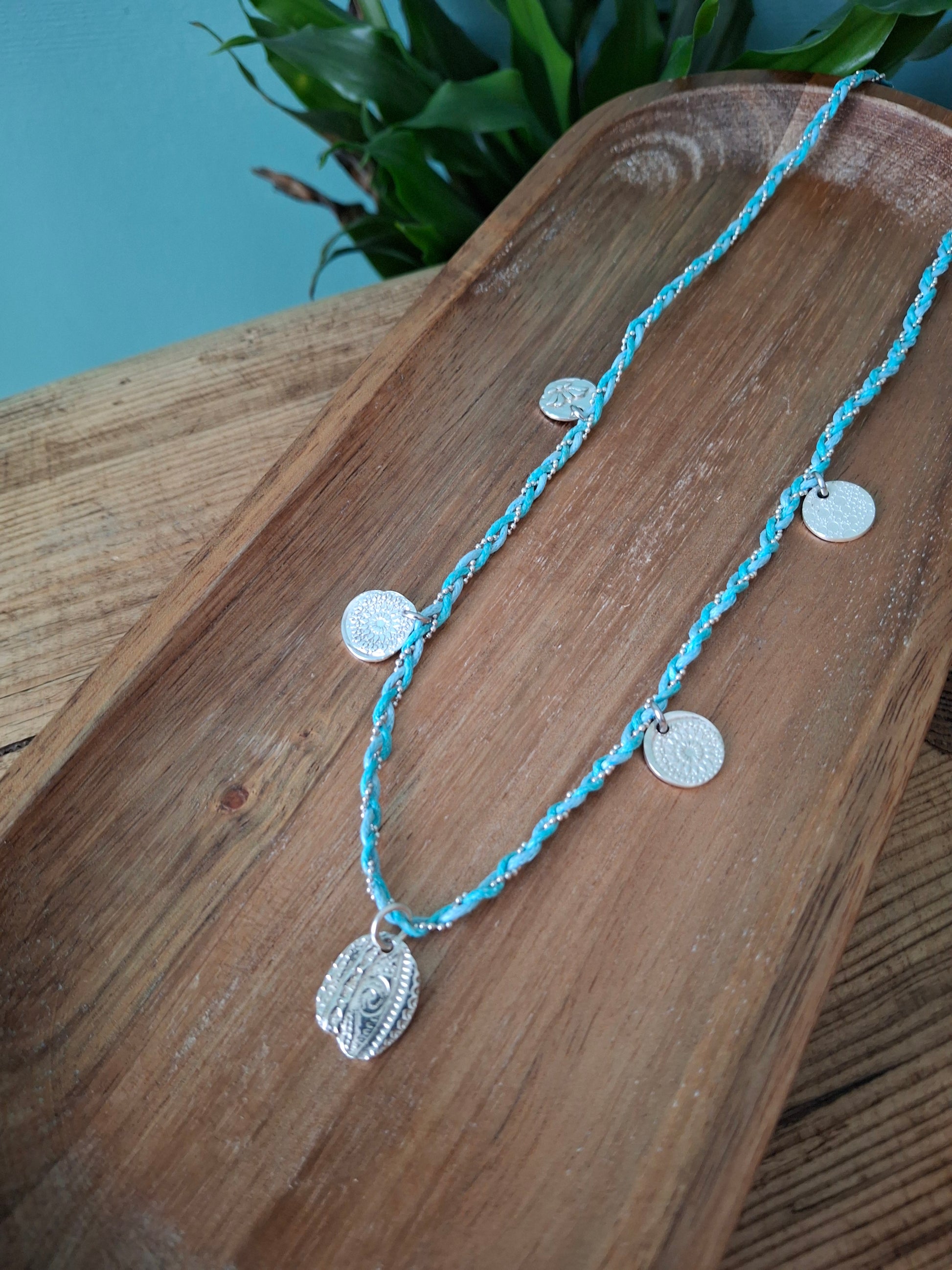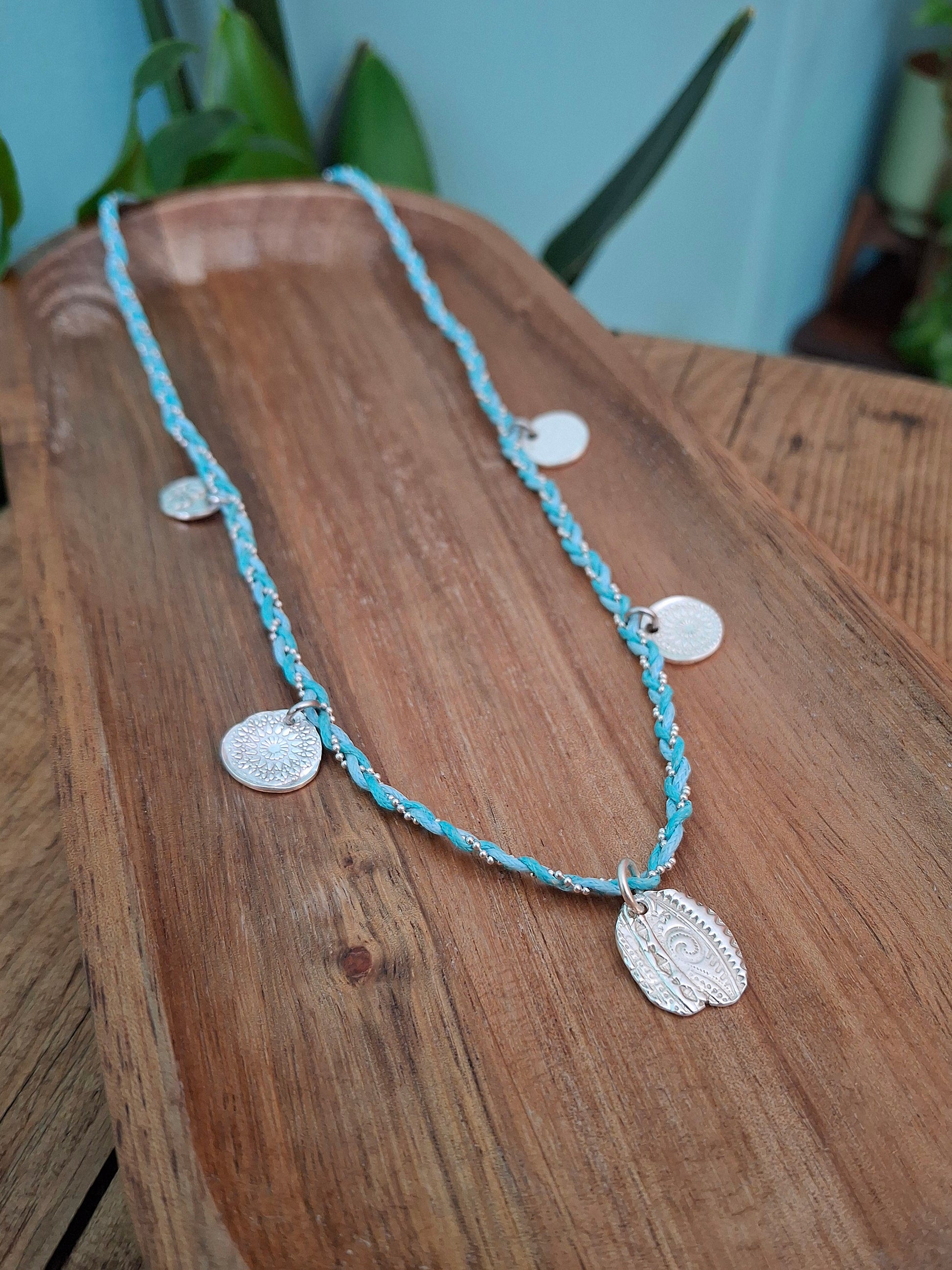 🧡 A beautiful one of a kind boho charm necklace braided with 2 turquoise coloured waxed cotton cords and a silver chain ball string.