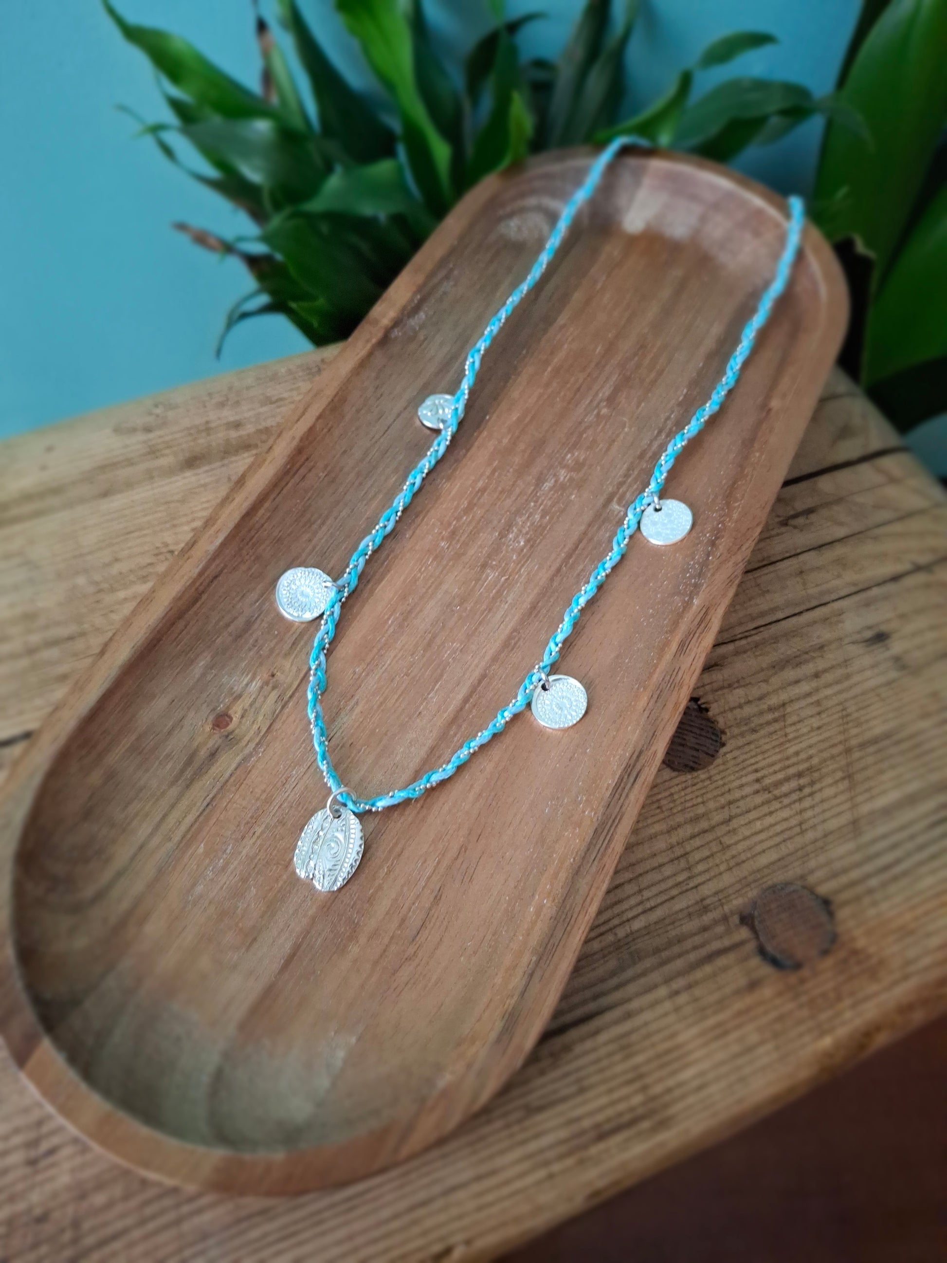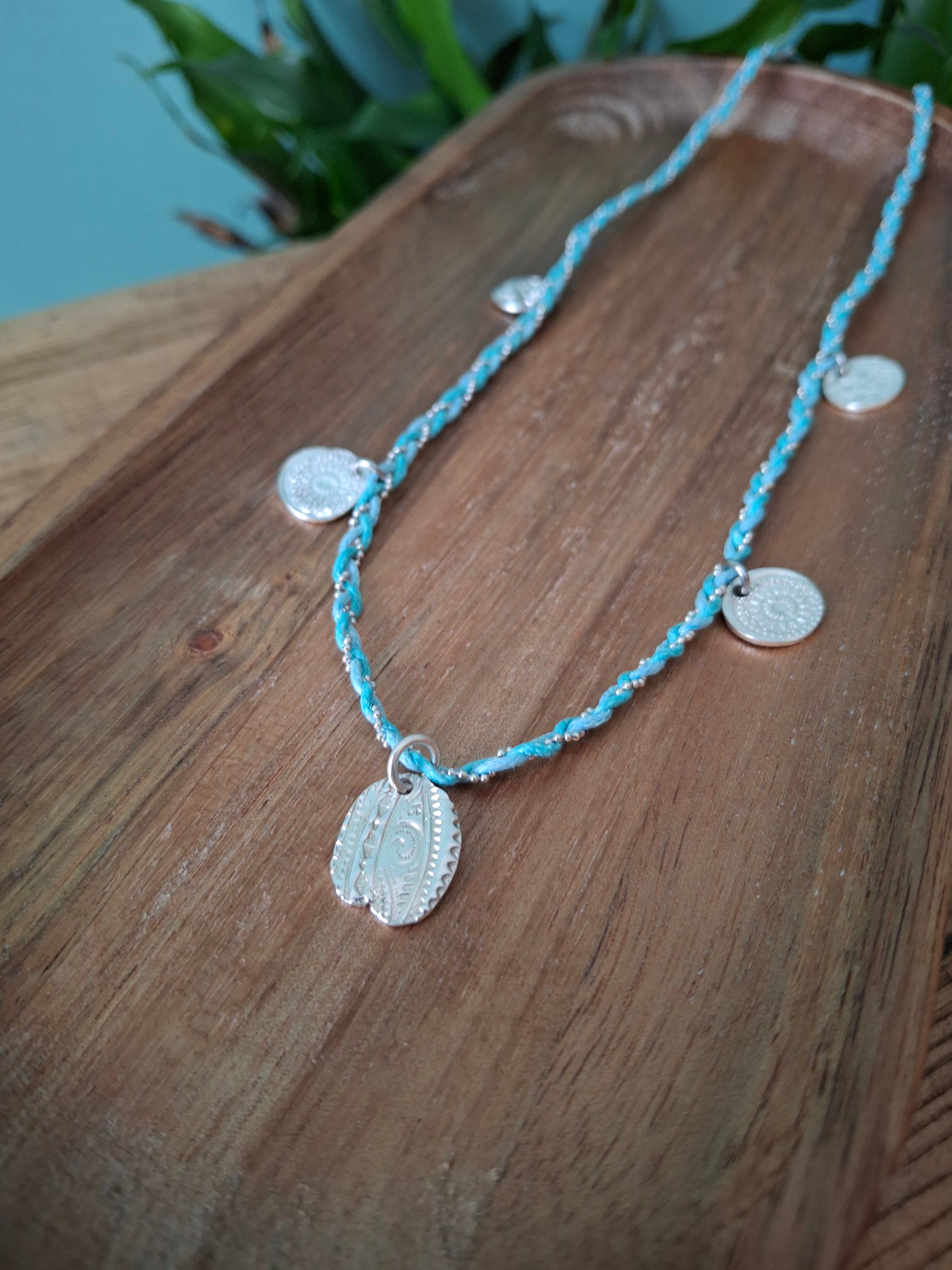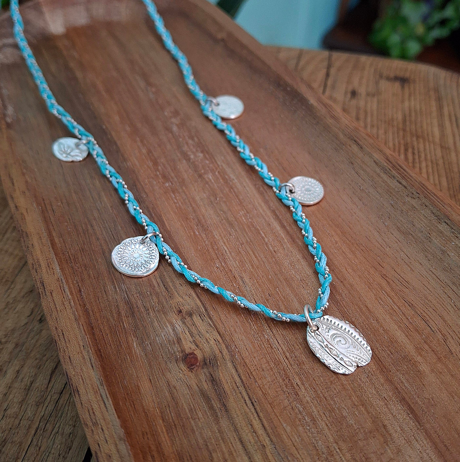 🧡 A beautiful one of a kind boho charm necklace braided with 2 turquoise coloured waxed cotton cords and a silver chain ball string.