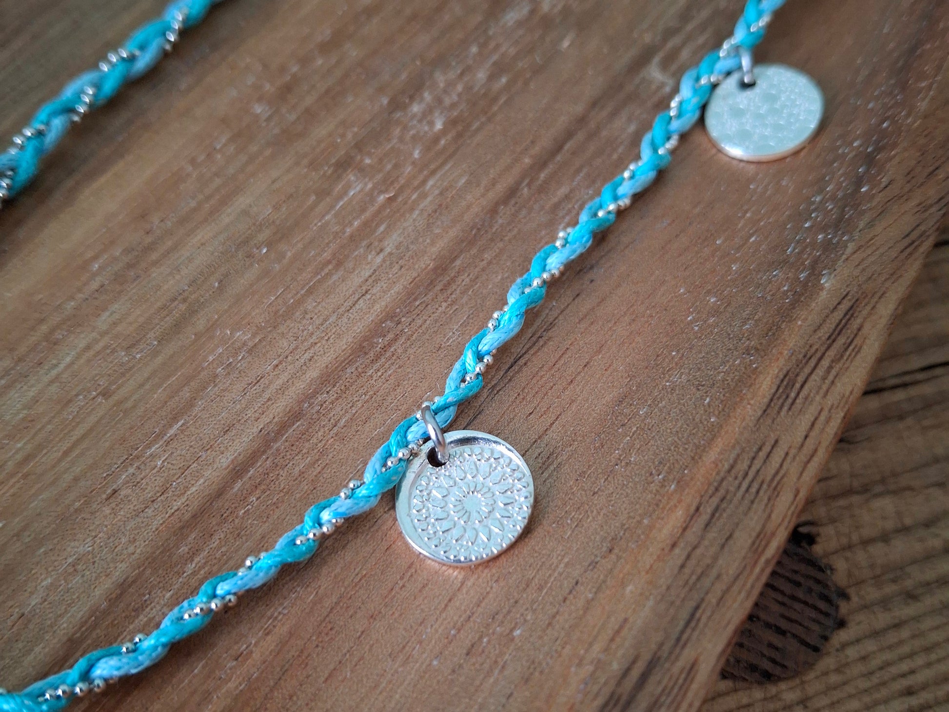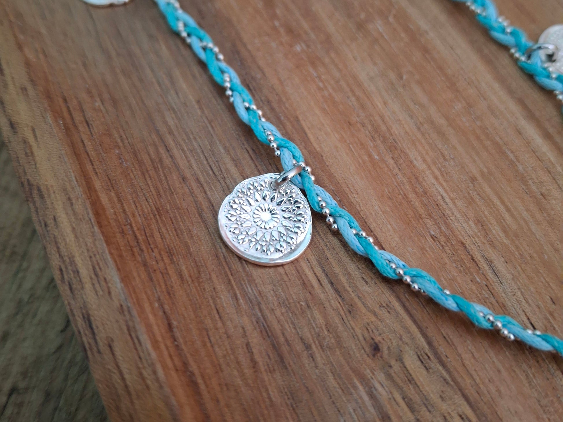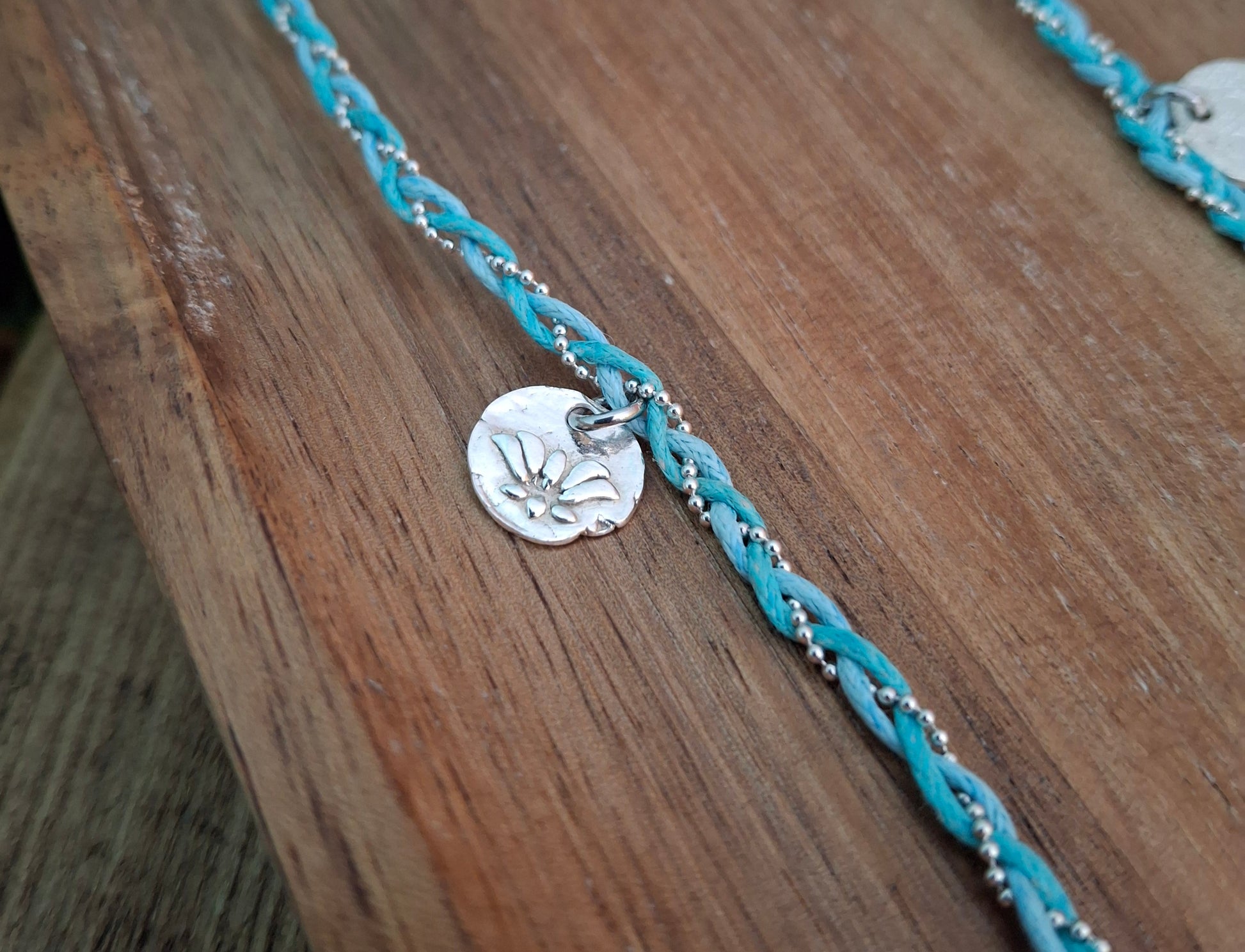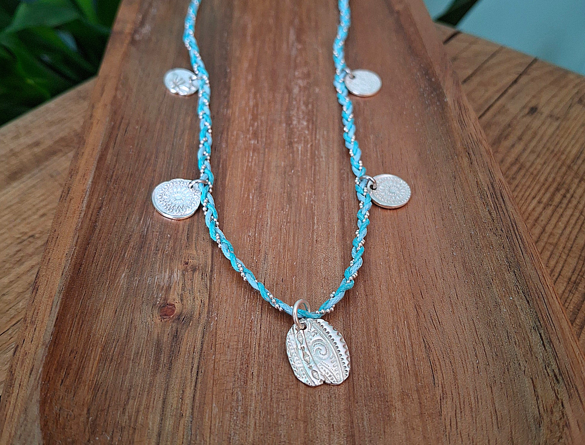 🧡 A beautiful one of a kind boho charm necklace braided with 2 turquoise coloured waxed cotton cords and a silver chain ball string.