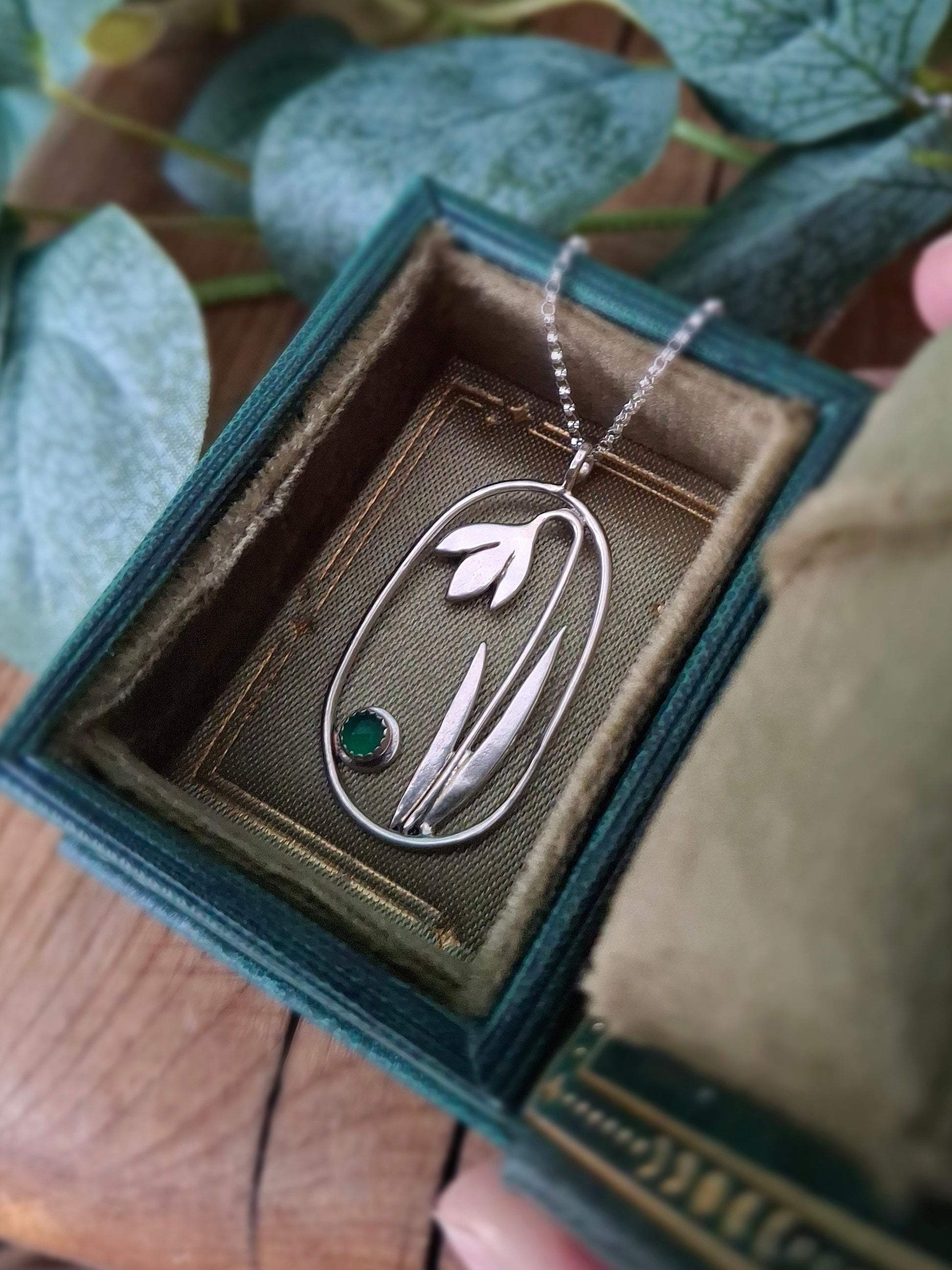 This oval snowdrop pendant necklace is a real eye-catcher. A minimalistic side profile of a snowdrop flower, beautiful arranged with a small green onyx stone that wonderfully reflects the cool green hues of snowdrop leaves.