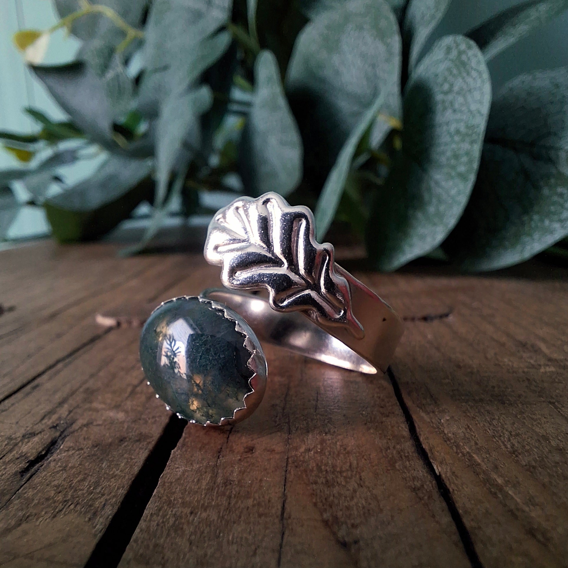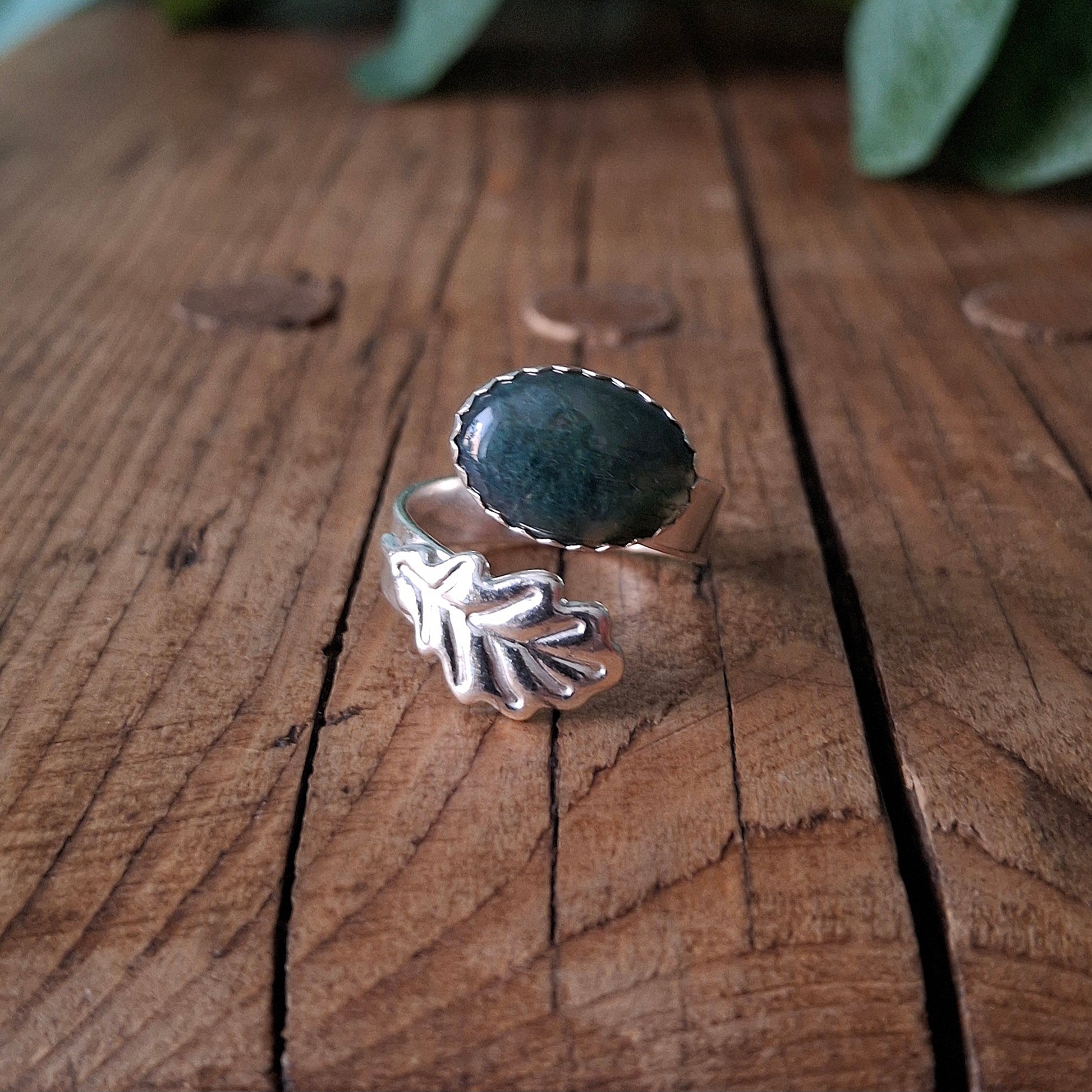 ❤ The perfect statement ring for nature lovers. A beautiful silver oak leaf with a dark green Moss Agate on a sturdy open ring band.