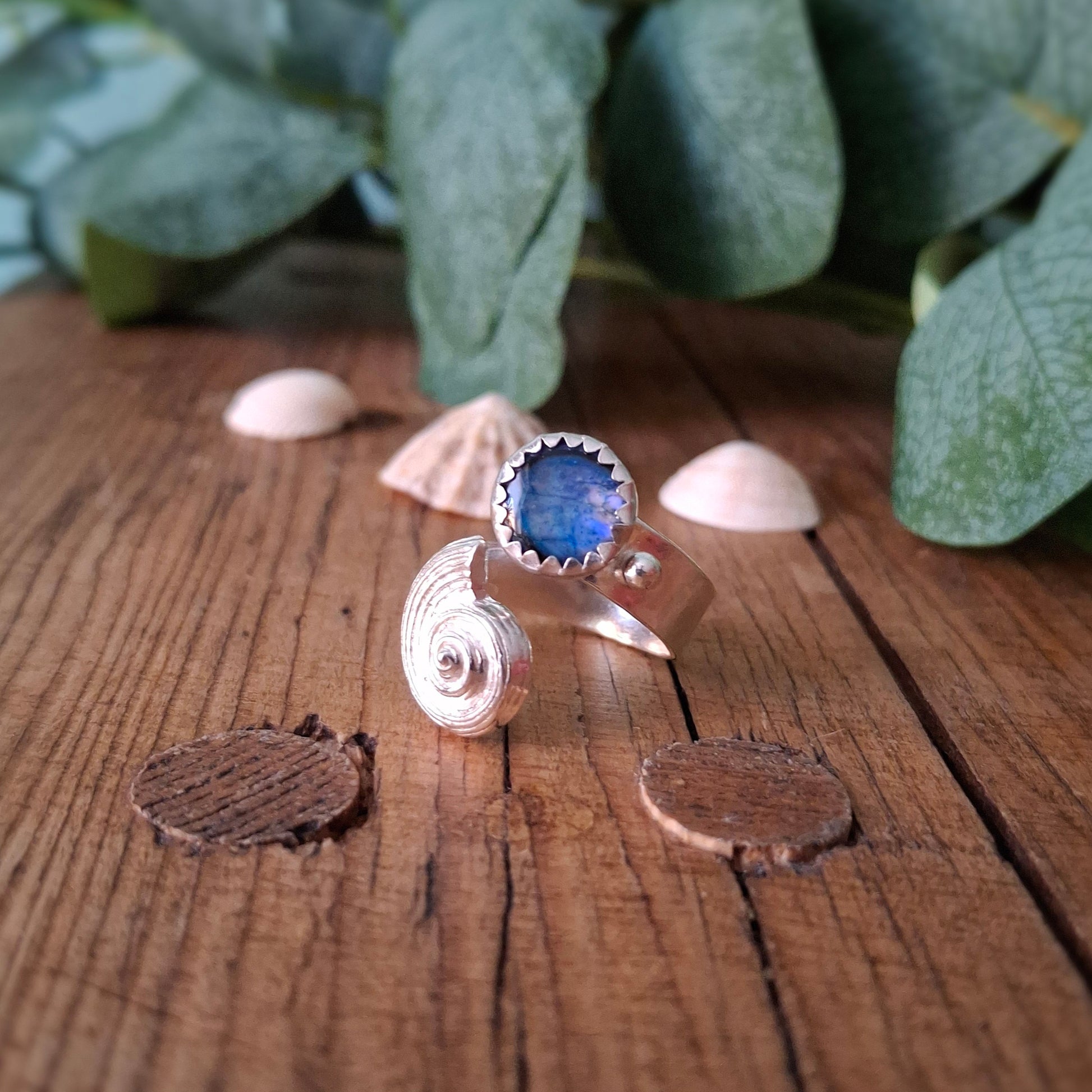 The perfect holiday ring to show your love for the seaside. A swirly silver shell sits at the bottom of the open ring, with a blue shimmering Abalone shell as a counterpart, framed by a tiny silver pebble.