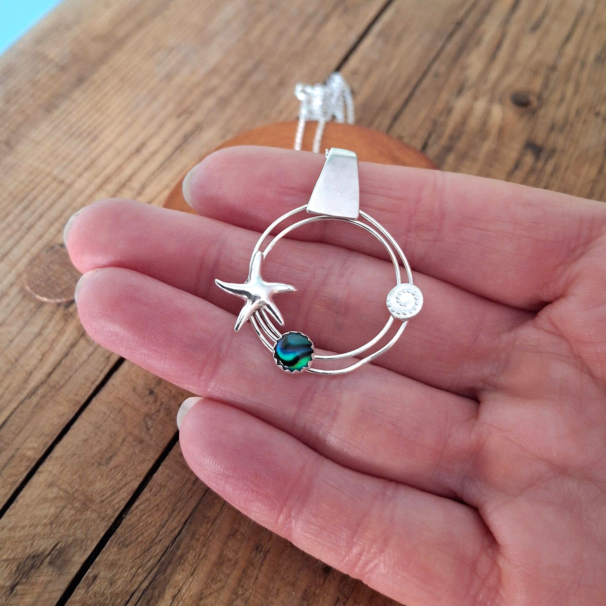 Handmade Silver Circle Ocean Pendant with Starfish & Abalone
