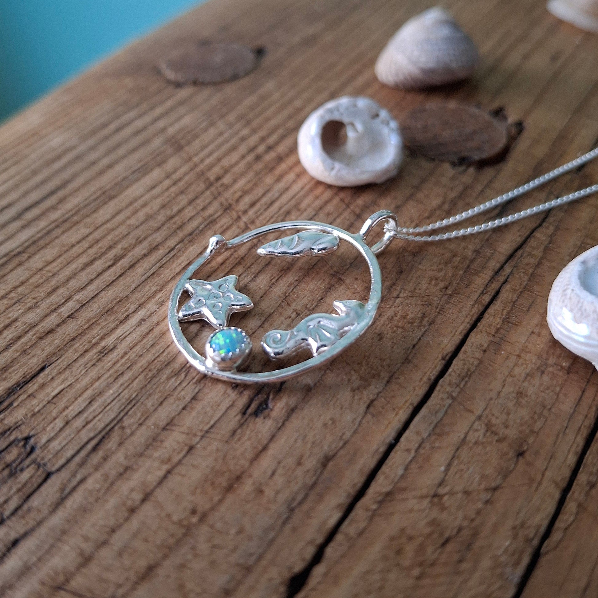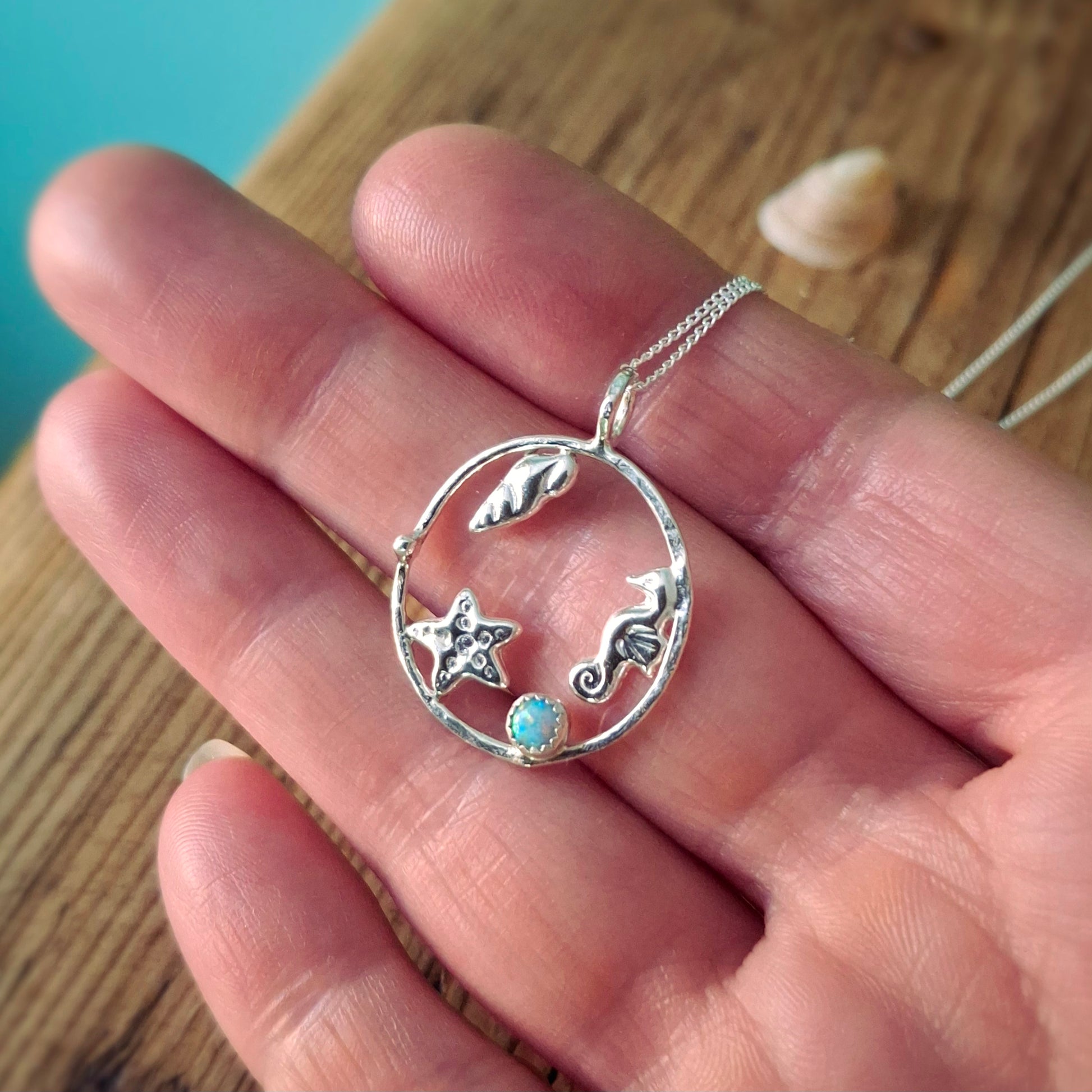 A beautiful almost round pendant with a floating shell, starfish and seahorse, paired with a bright glittering turquoise opal stone make this the perfect piece for a seaside lover.