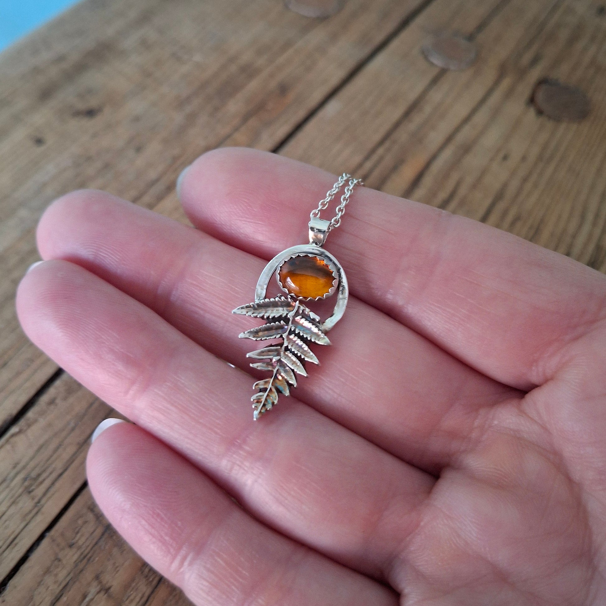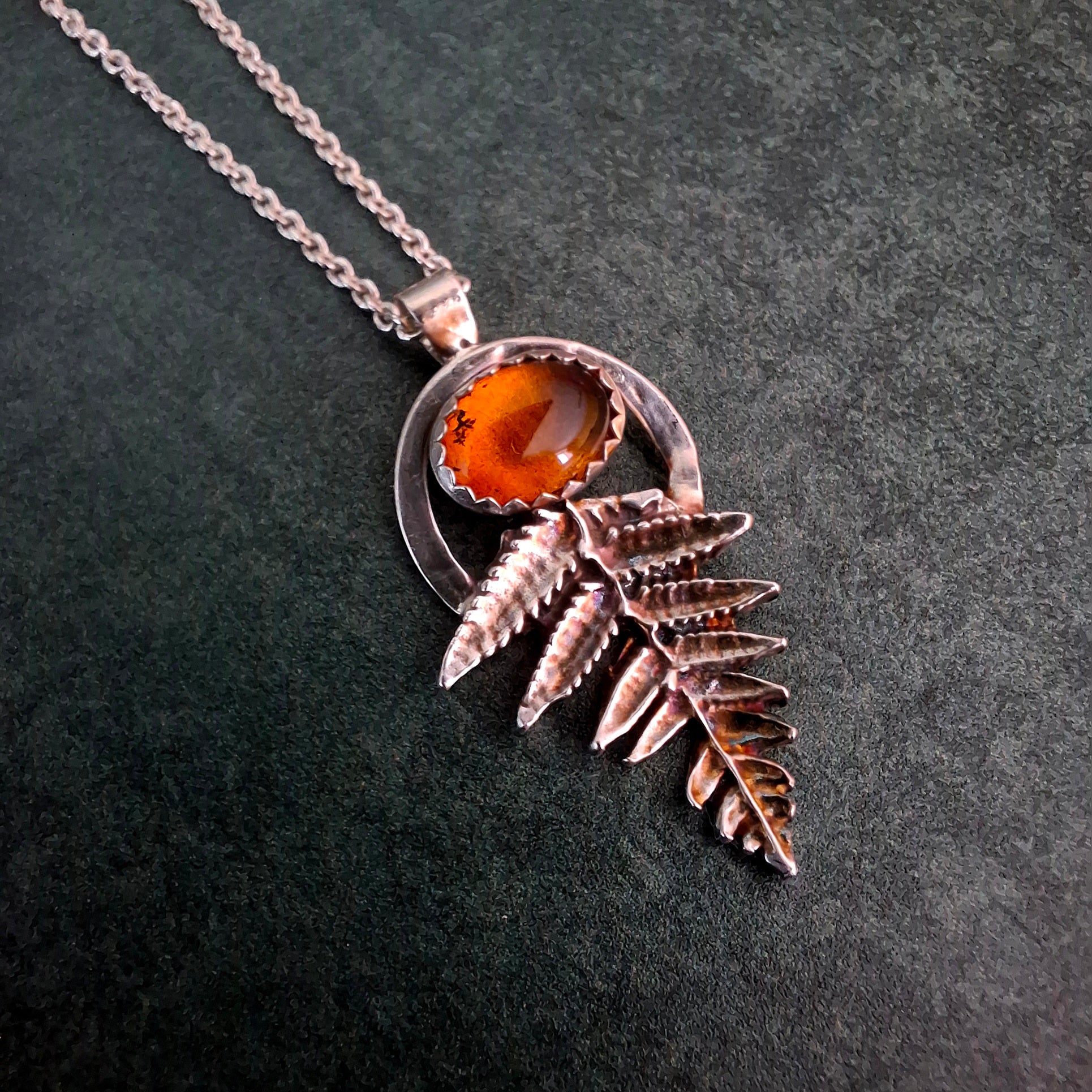 A beautiful autumnal fern leaf with a deep glowing amber stone surrounded by a silver ring. It has a high polished finish with interesting patina details on the leaf.