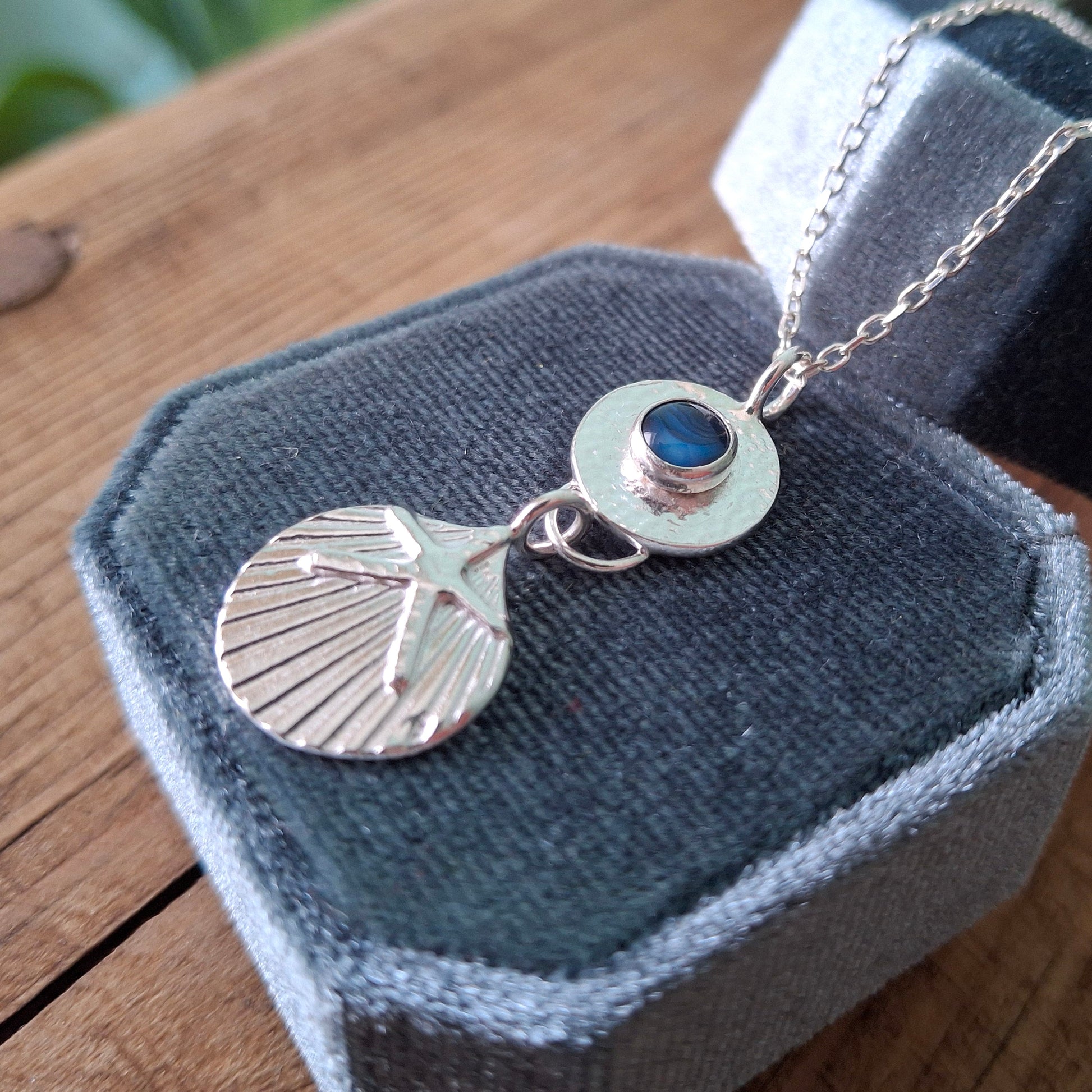 This seaside pendant has an usual 2 part shape with a hammered round charm that holds a paua shell and a hanging bigger shell charm with a star fish.