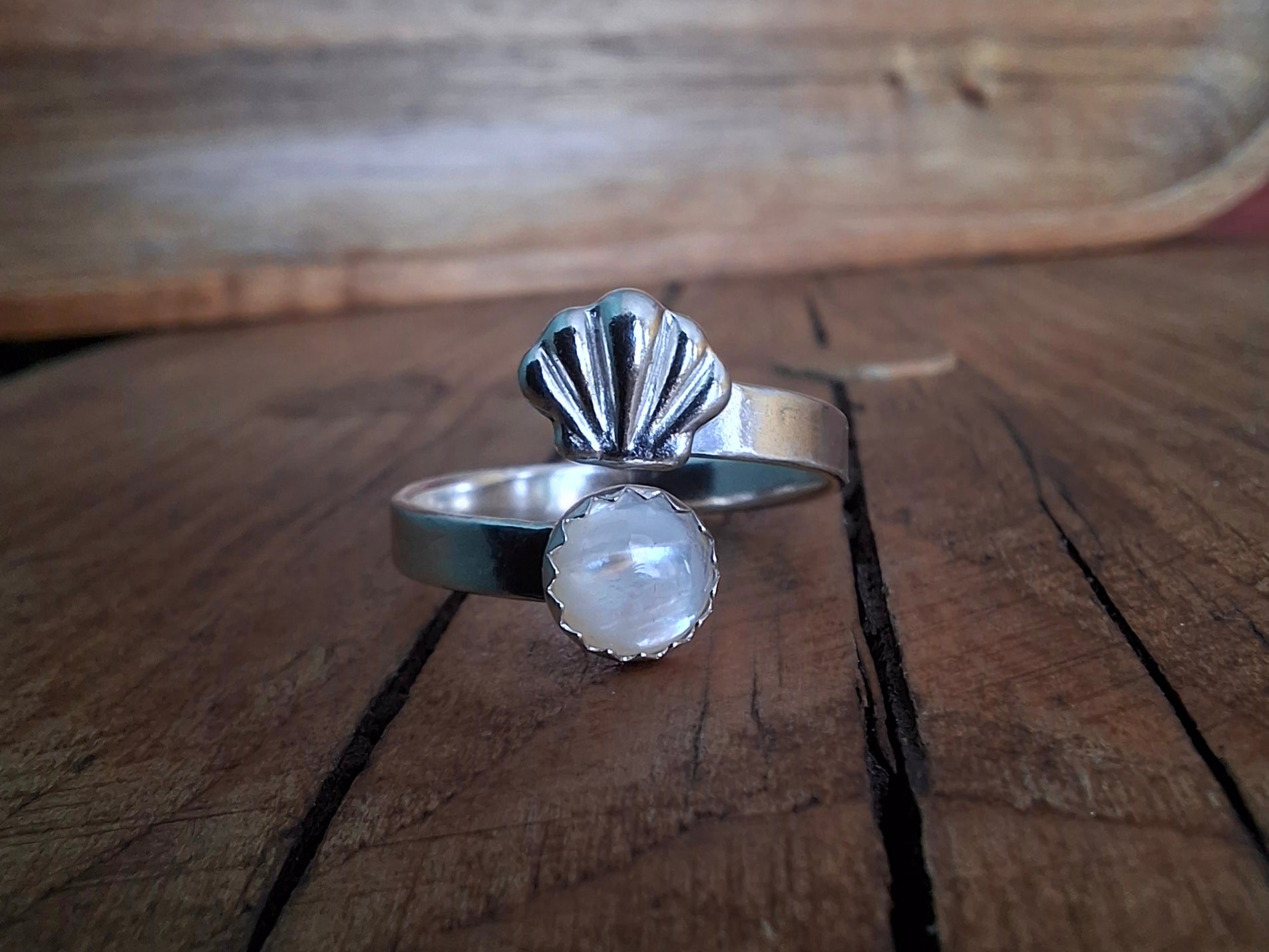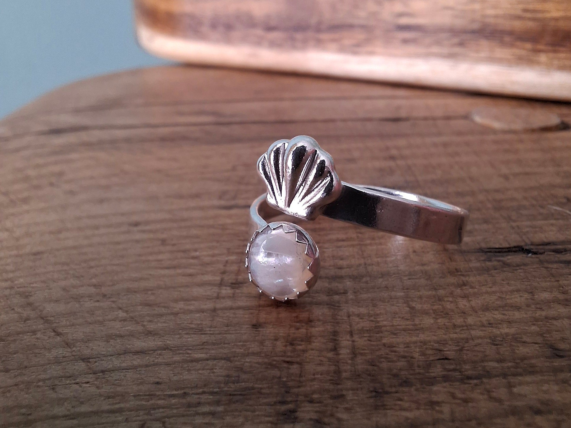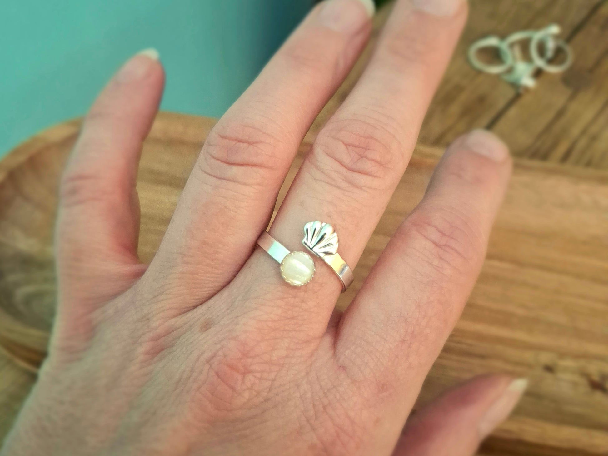 💚 The Ring band is 3mm wide and the Mother of Pearl stone is 5mm big. The ring has a UK size P½ and can be a little bit adjusted by pulling it gently apart or squeezing it slightly together.