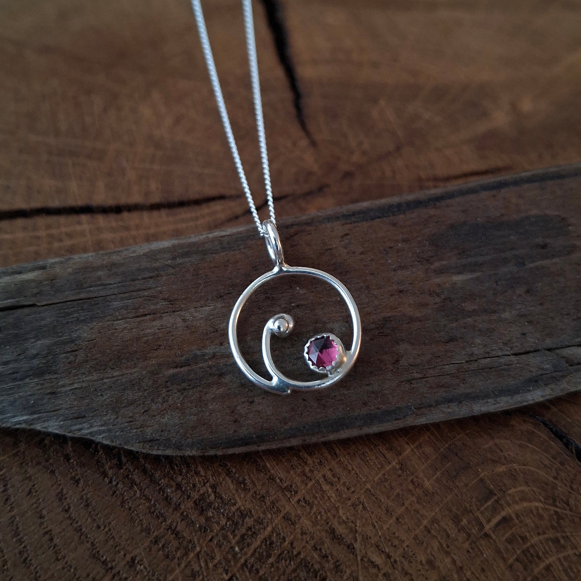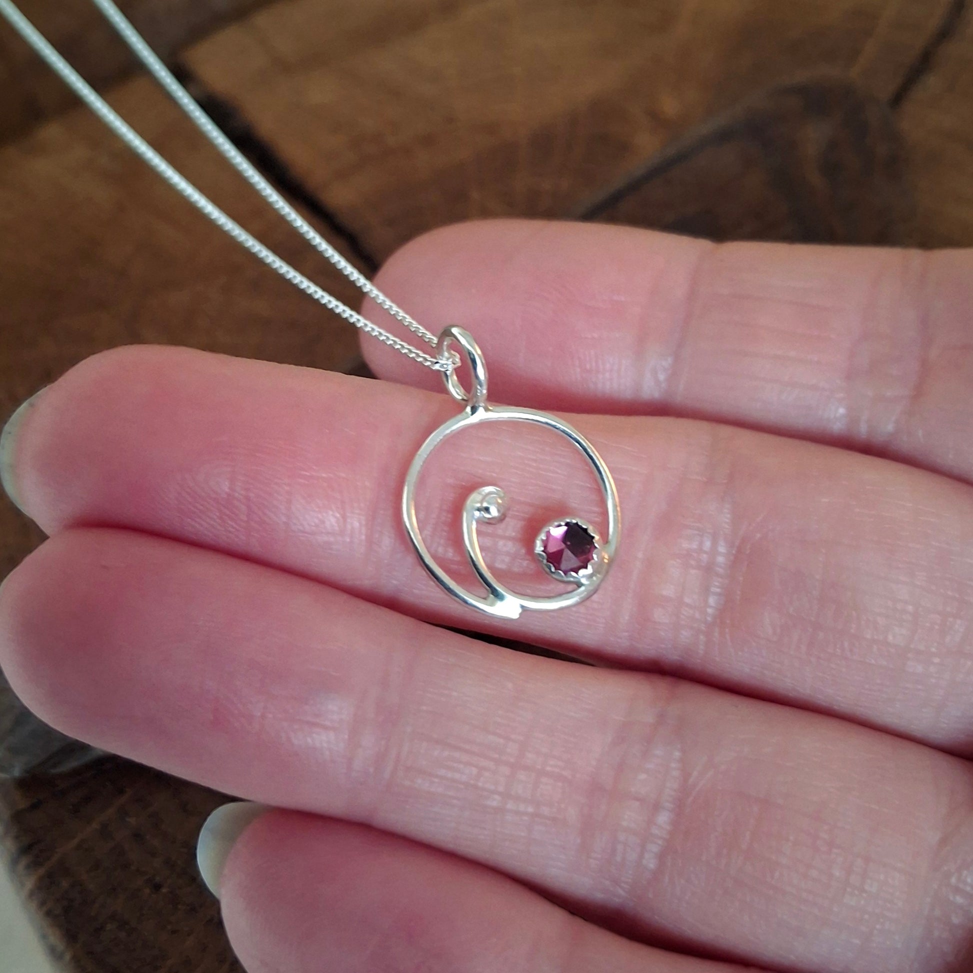 This small swirly pendant has a beautiful flowing dynamic and the burgundy garnet adds a touch of elegance