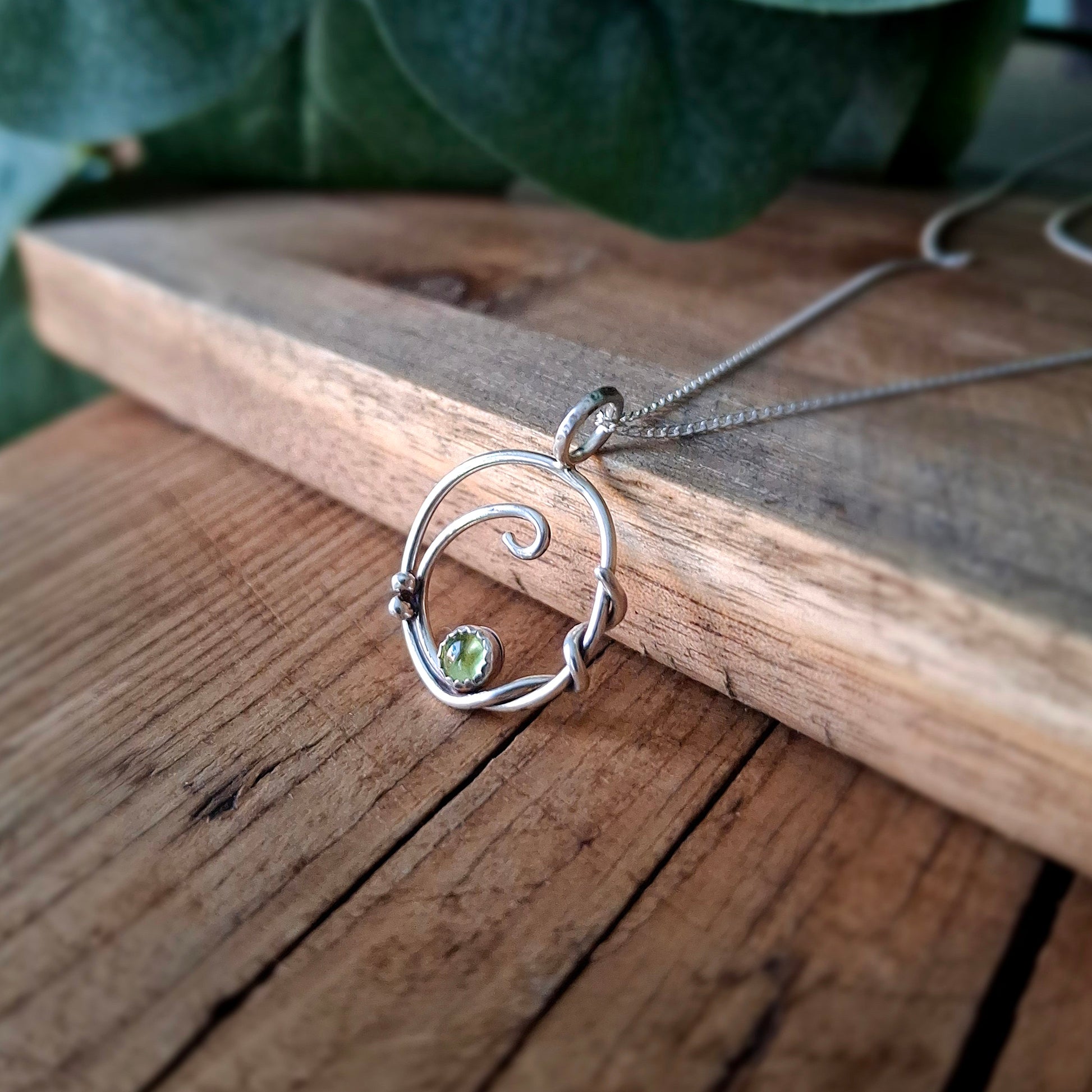 This wire wrapped vine pendant has a beautiful flowing dynamic embodying the continuous flow of nature, the bright and fresh peridot feels well balanced and calming.