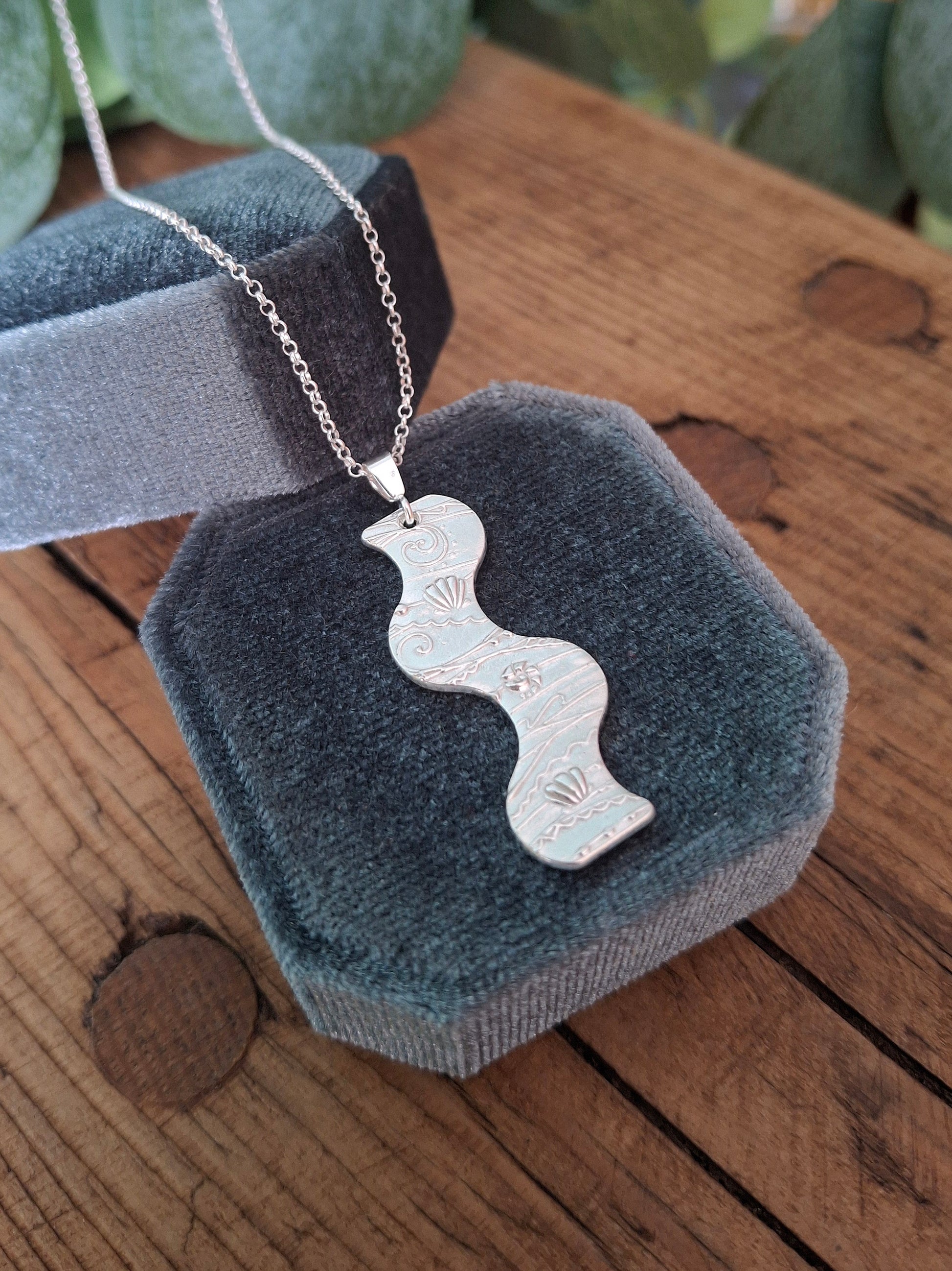This seaside pendant has an usual long wavy shape with very detailed tiny shell and beach shapes on the front