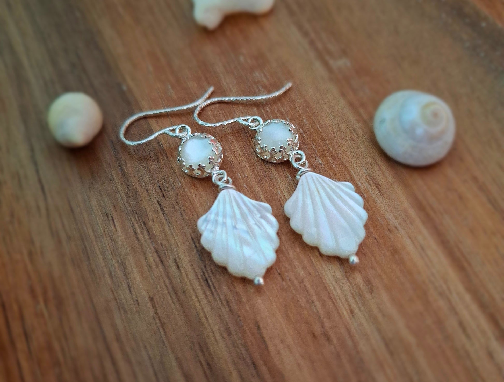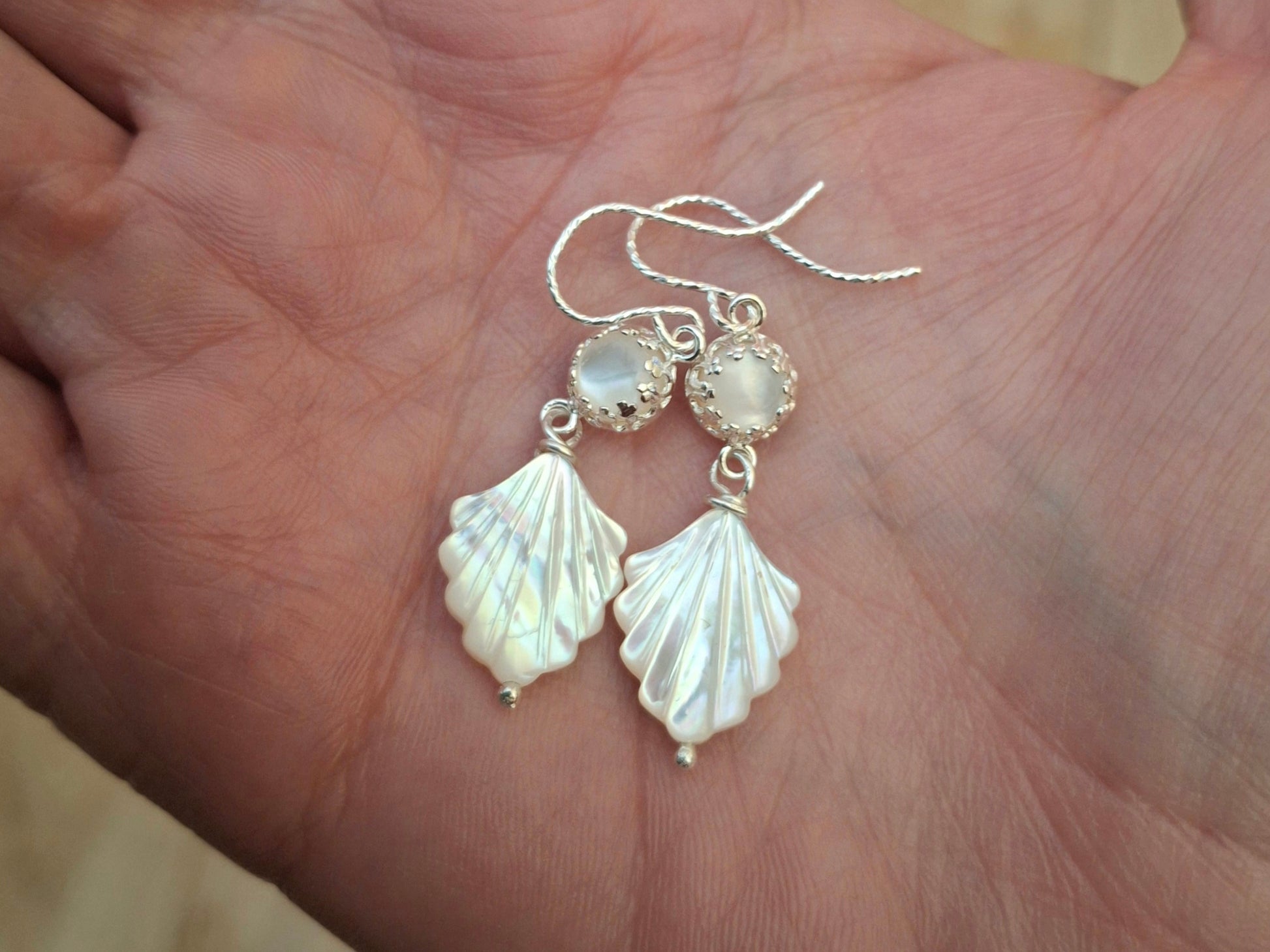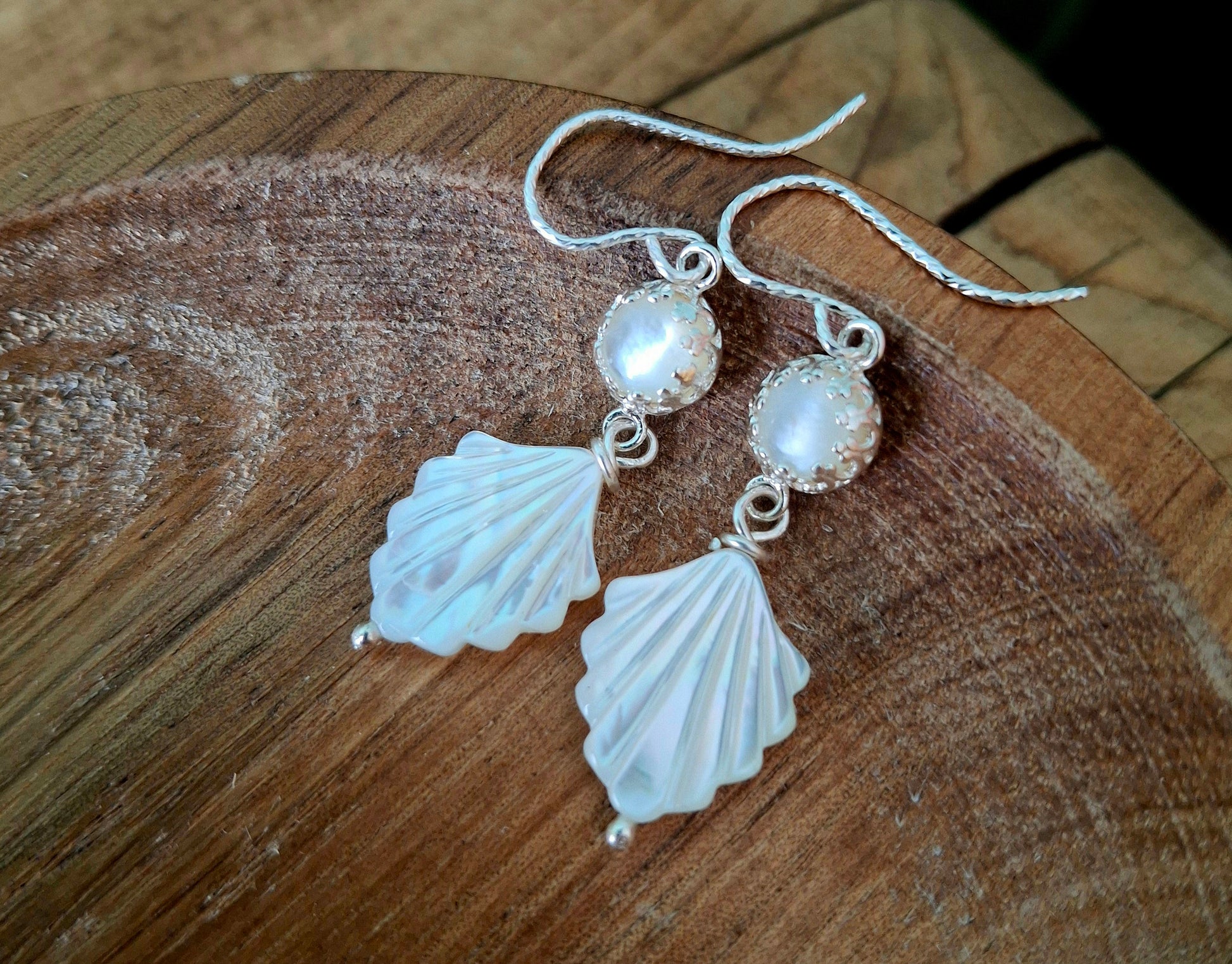 Beautiful soft shimmering shell shaped mother of pearl beads and round mother of pearl stones in a beautifully ornamental silver setting make these earrings a really romantic and chic summer stable.