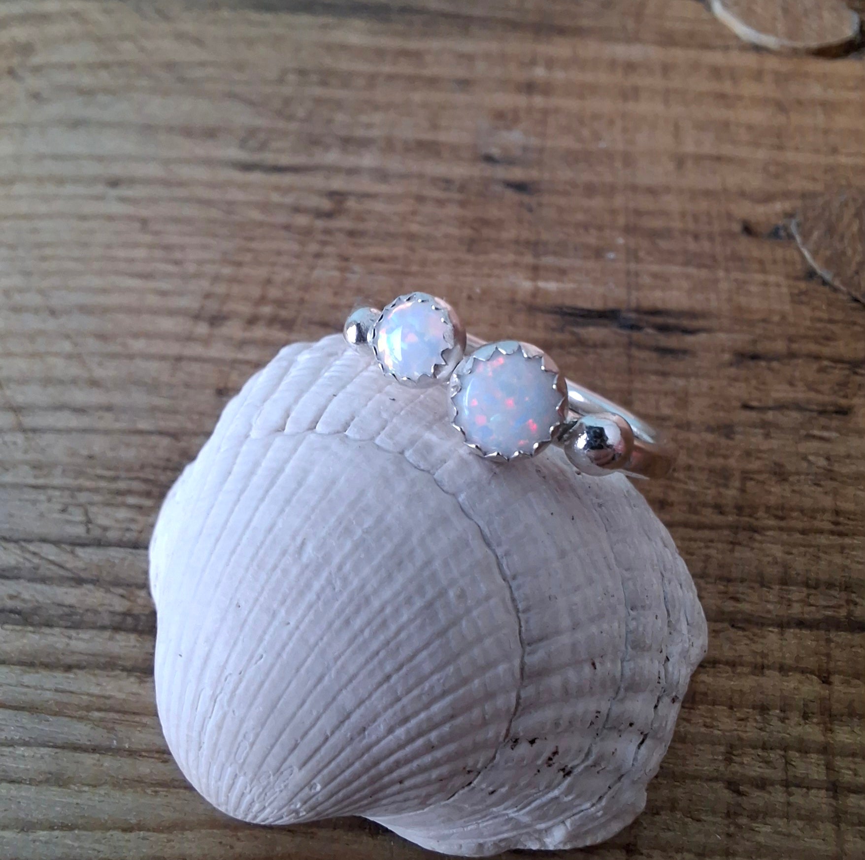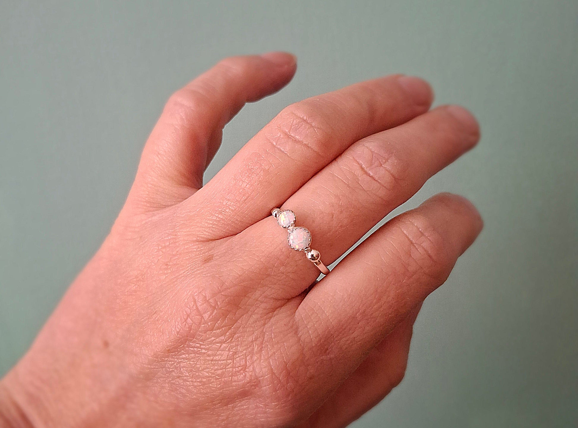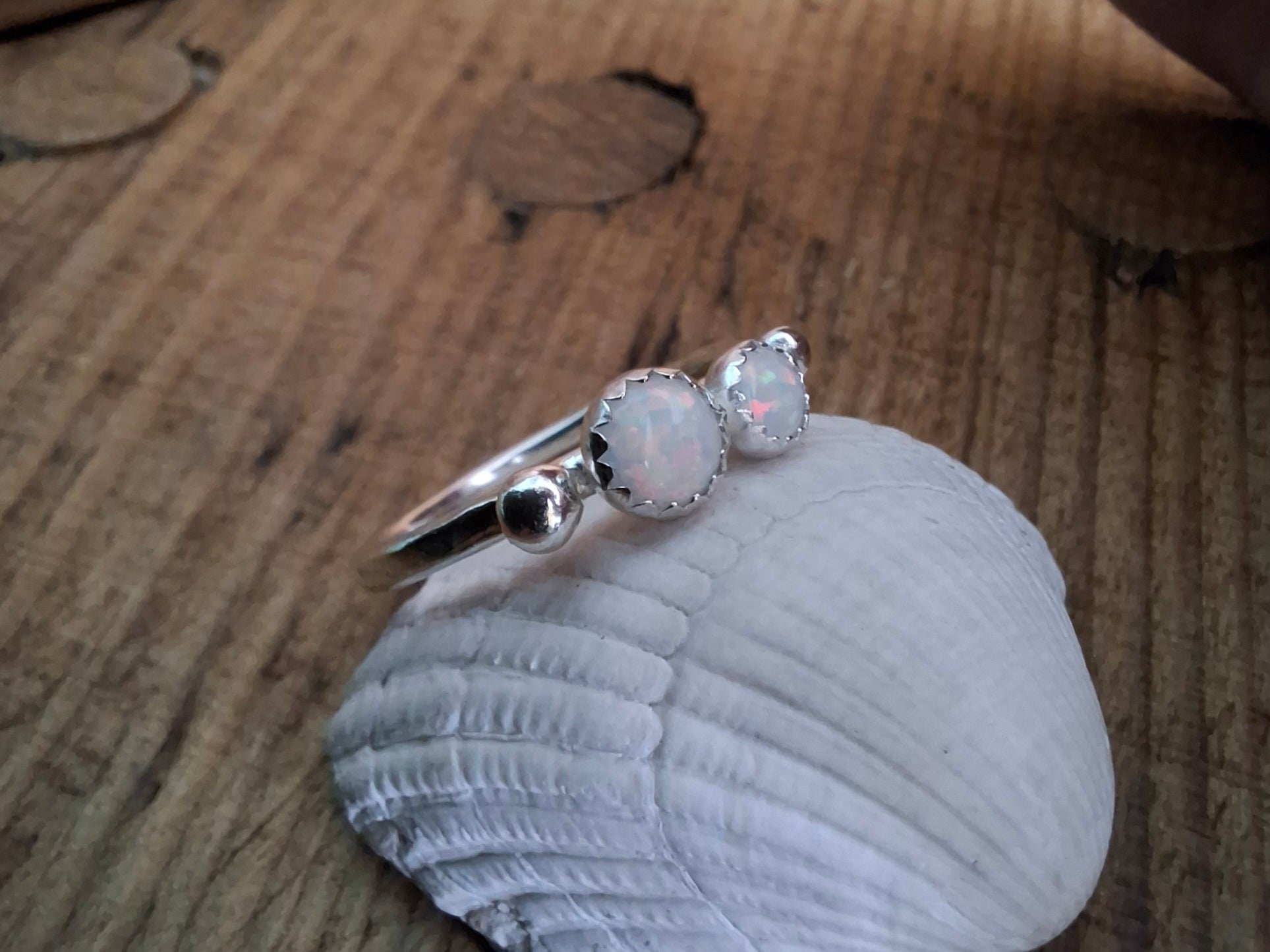 💚 The Ring band is 2 mm thick, the lab created opal stones have a beautiful white shimmer with flashes of green and red and are 4&5mm big. The ring has a UK size N. It's a very snug/smallish N
