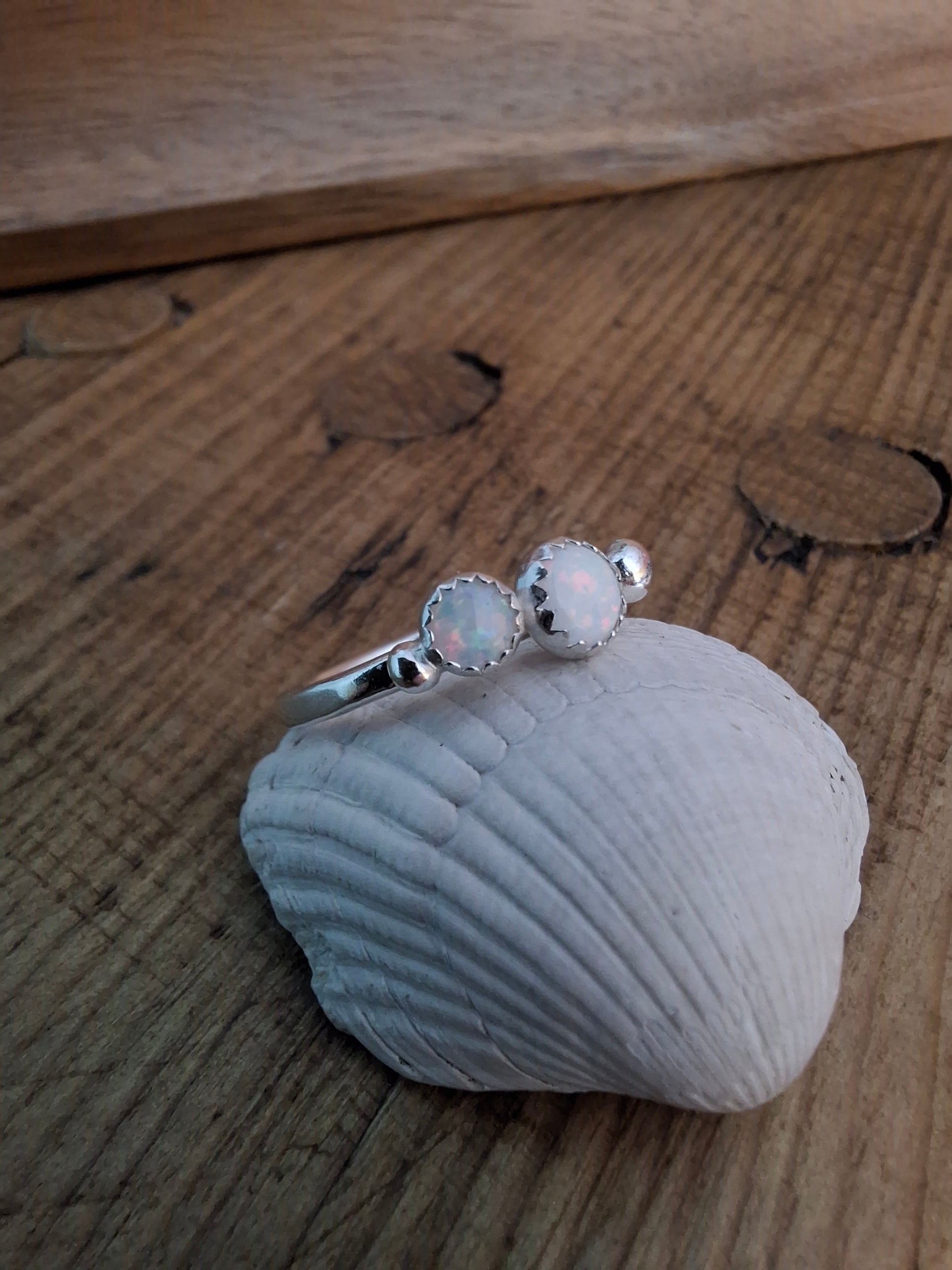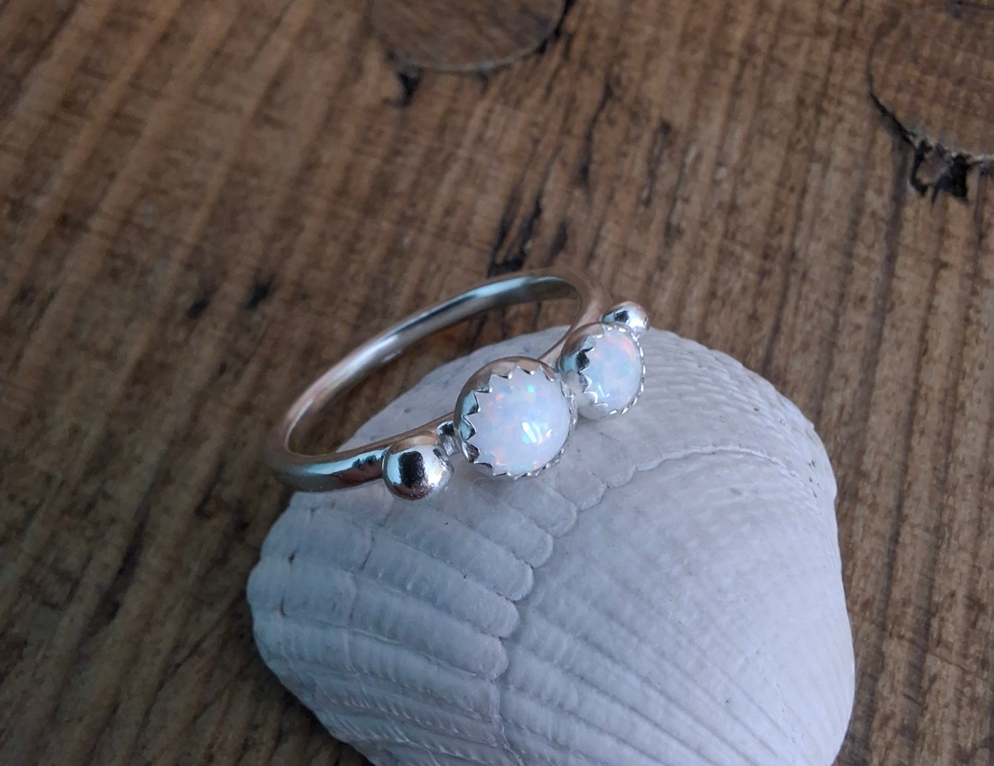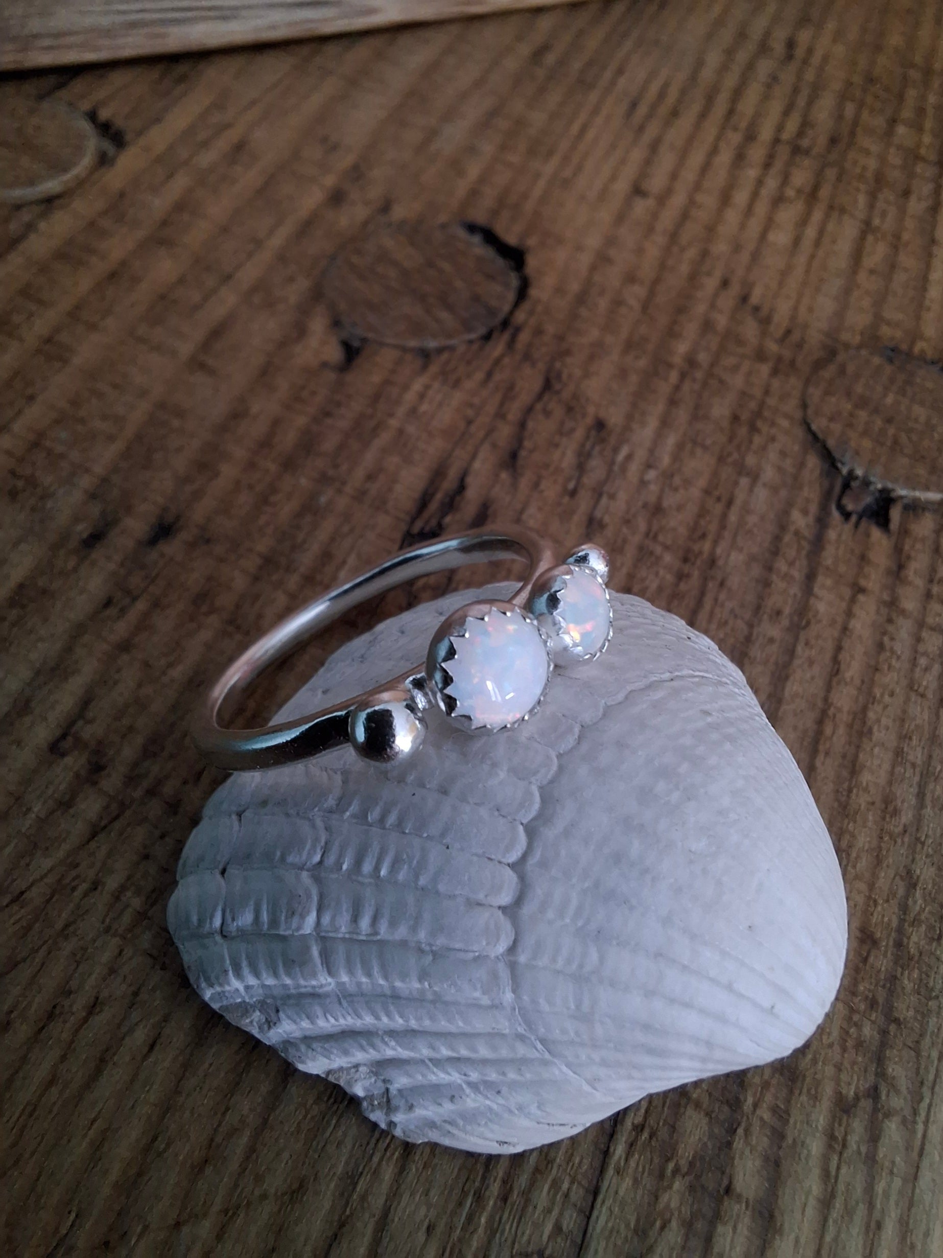 💚 The Ring band is 2 mm thick, the lab created opal stones have a beautiful white shimmer with flashes of green and red and are 4&5mm big. The ring has a UK size N. It's a very snug/smallish N