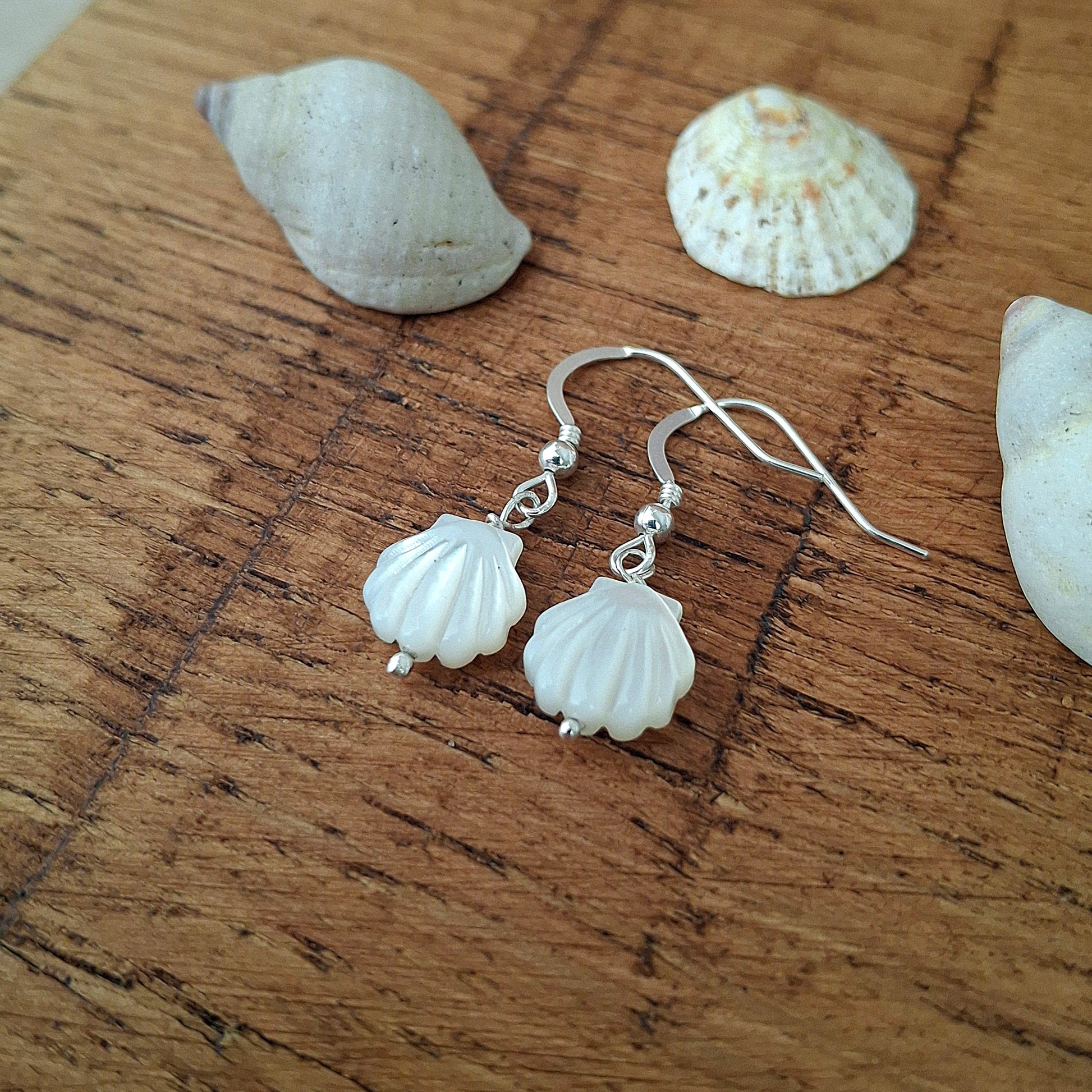 Beautiful soft shimmering shell shaped mother of pearl beads paired with sterling silver ear hooks that create a really romantic and chic seaside look.