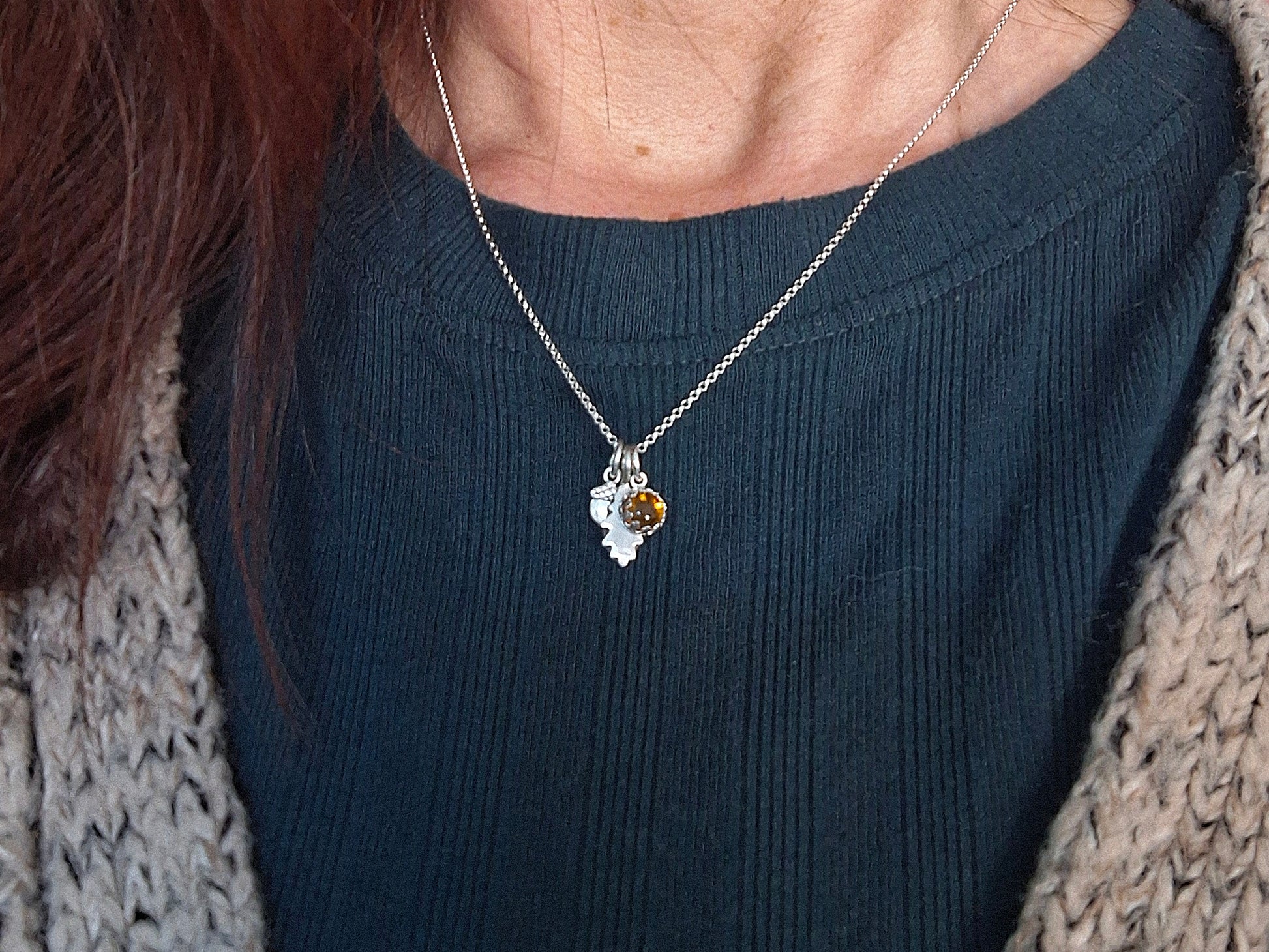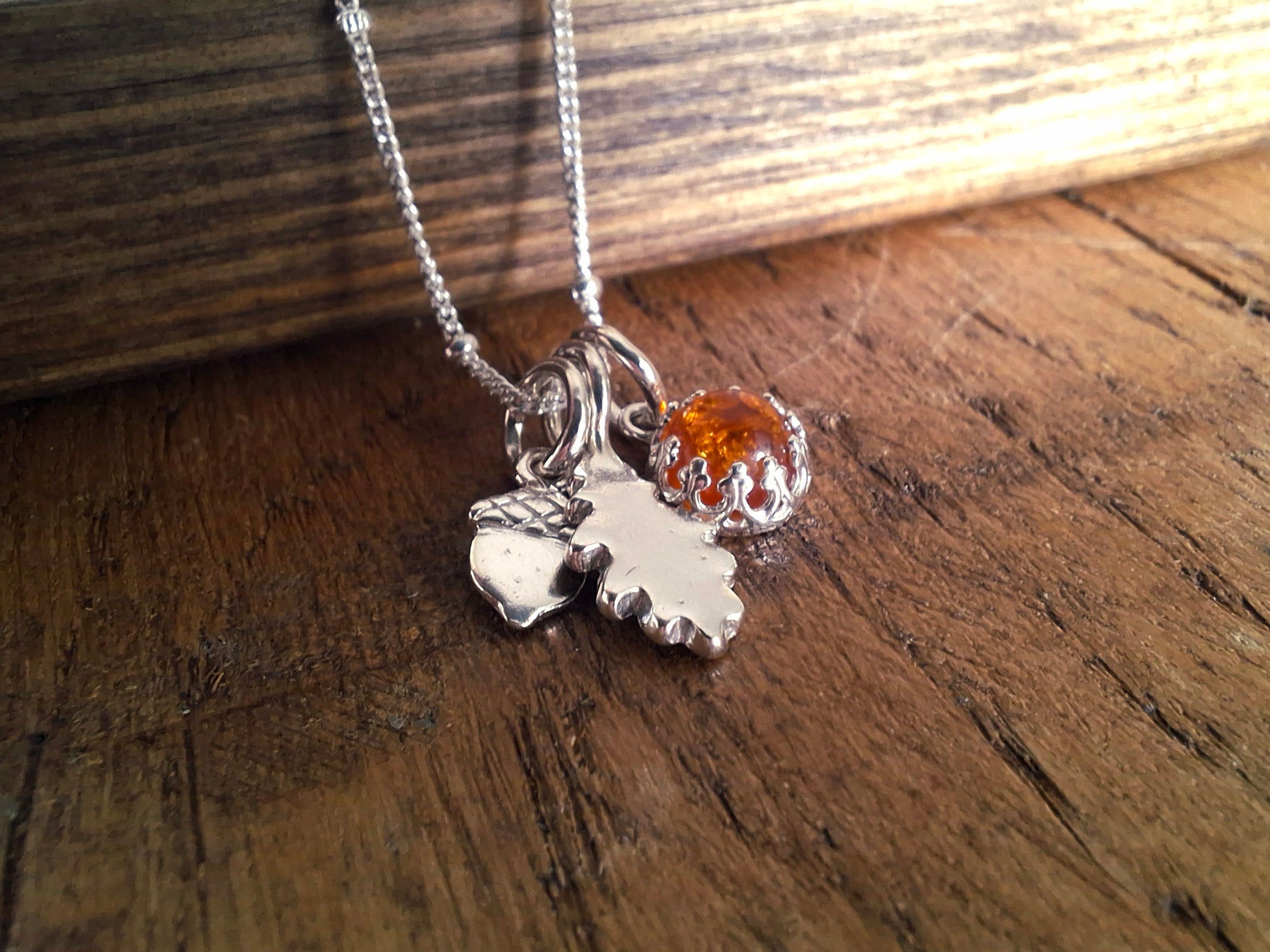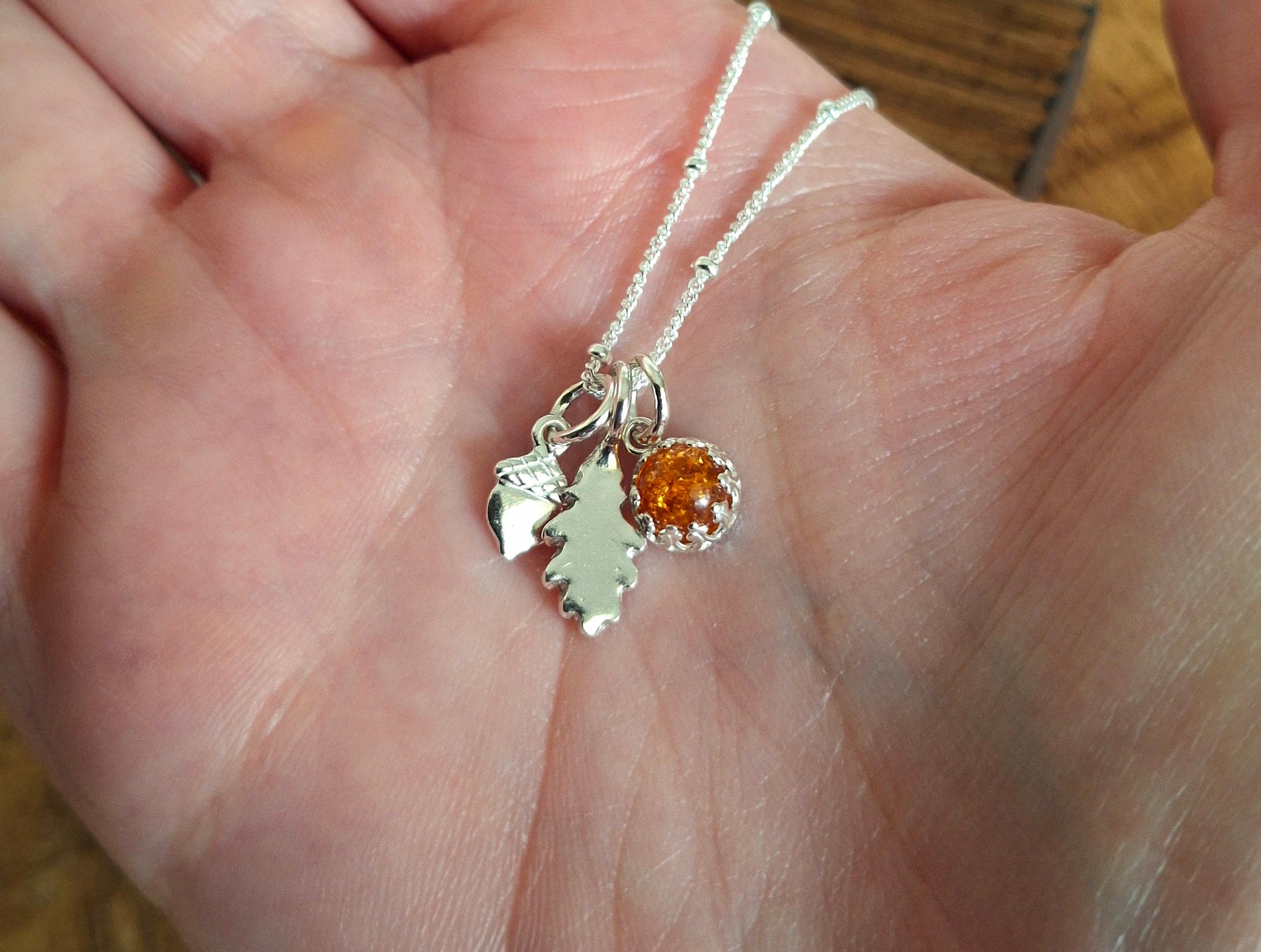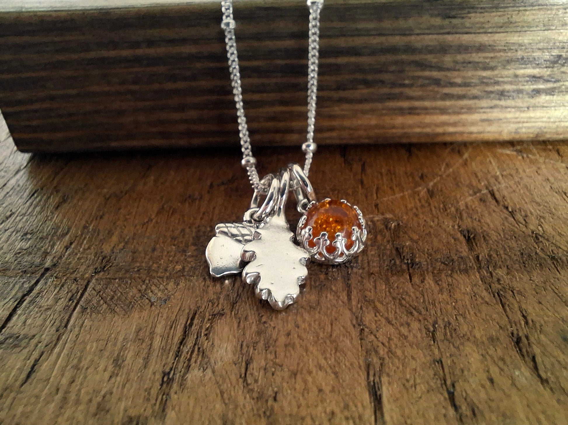 🧡 As always I have completely handcrafted this pendant with fine silver and sterling silver. The silver chain is 18inch (ca. 45cm) long. The oak leaf is 8mm long, acorn and amber charms are 6mm big. It comes lovingly gift wrapped in a box and an organza pouch. Free tracked UK shipping is included. International shipping is available.