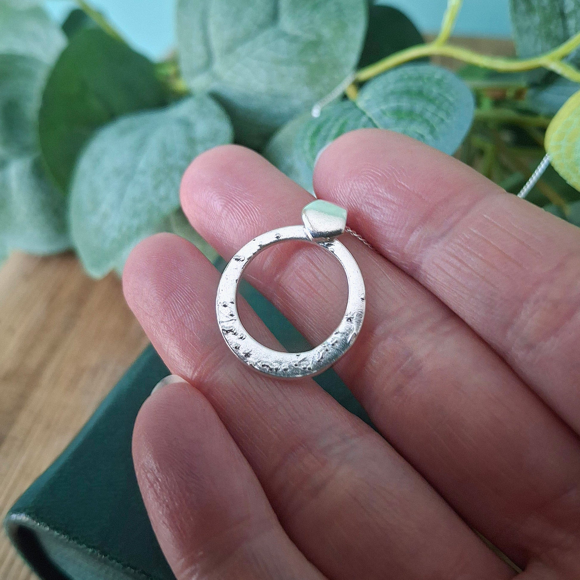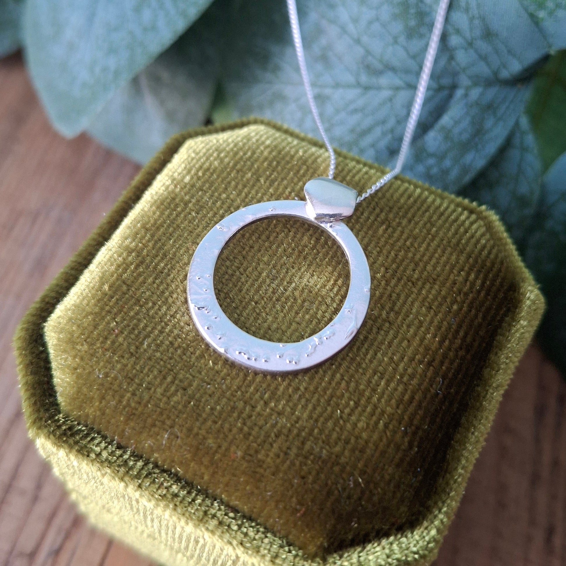 ❤ A lightly textured circle pendant with an interesting geometrical shaped bail loop attached to it.