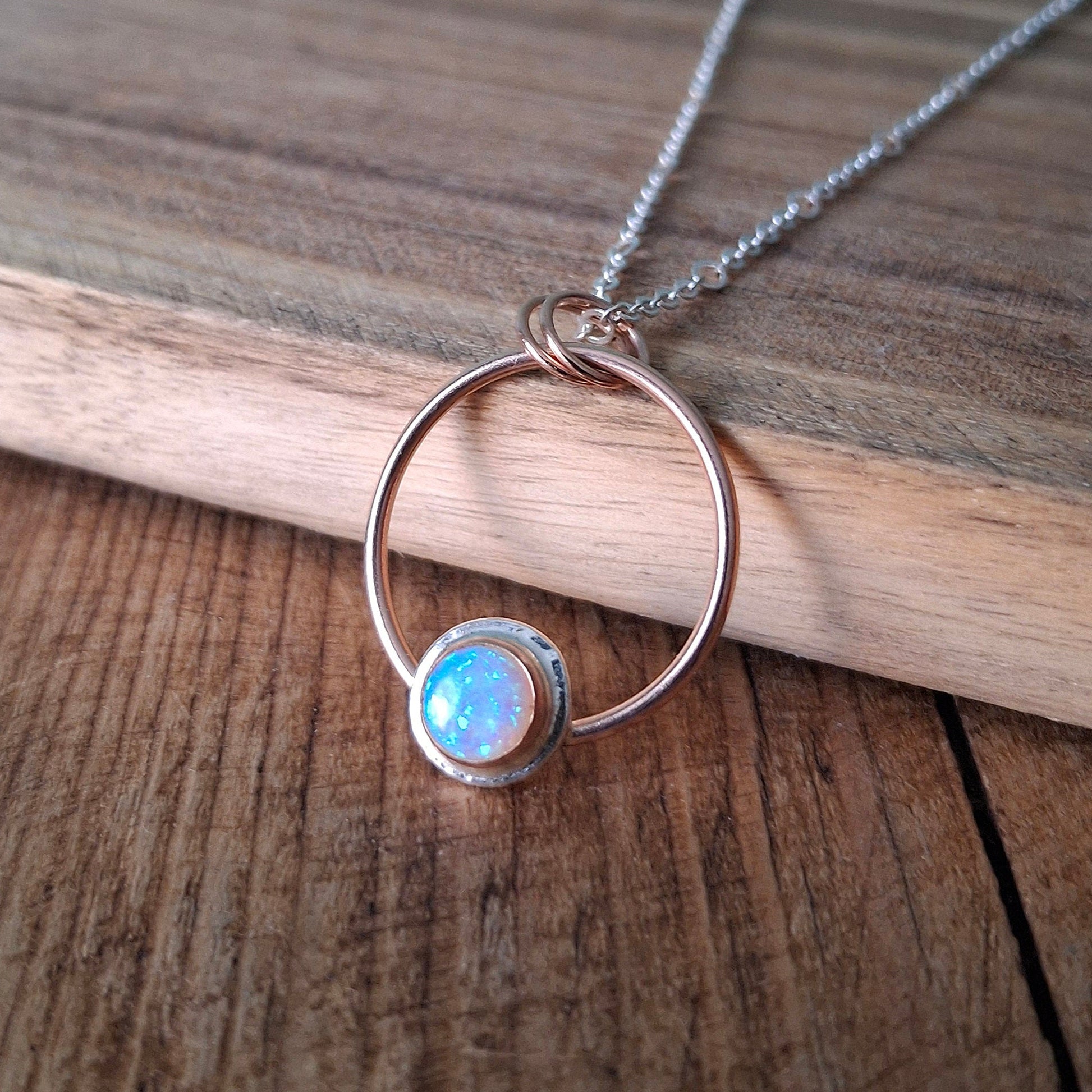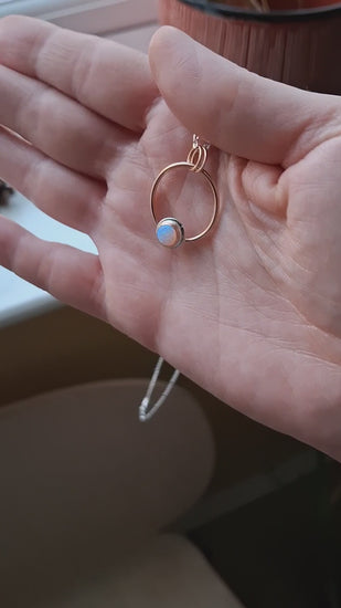 A minimalistic circle pendant with a white opal that has a soft rainbow glitter effect. Together with the cool rose-gold colour it reminds me of a soft pink winter sunrise. A moment of awe-inspiring beauty that holds so much happiness and energy for the day ahead.